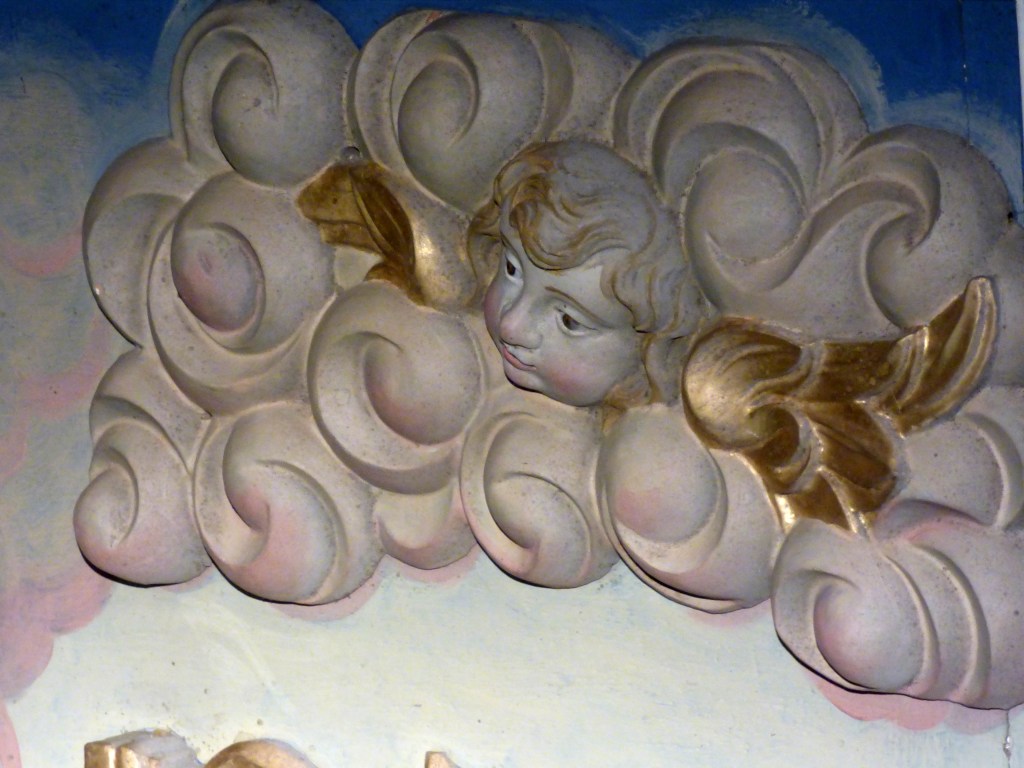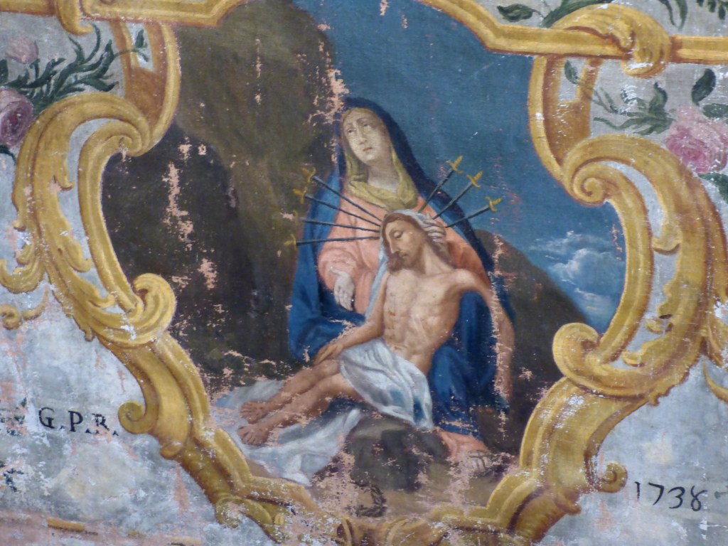 5 médaillons peints par Nicolas Oudéart : les mystères du Rosaire. 5 mystères joyeux (l’enfance) 5 mystères douloureux (la passion) et 5 mystères glorieux ( la résurrection).