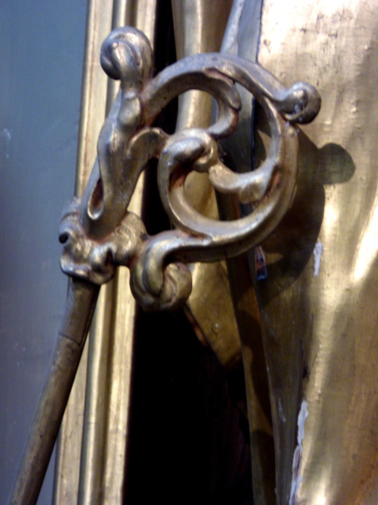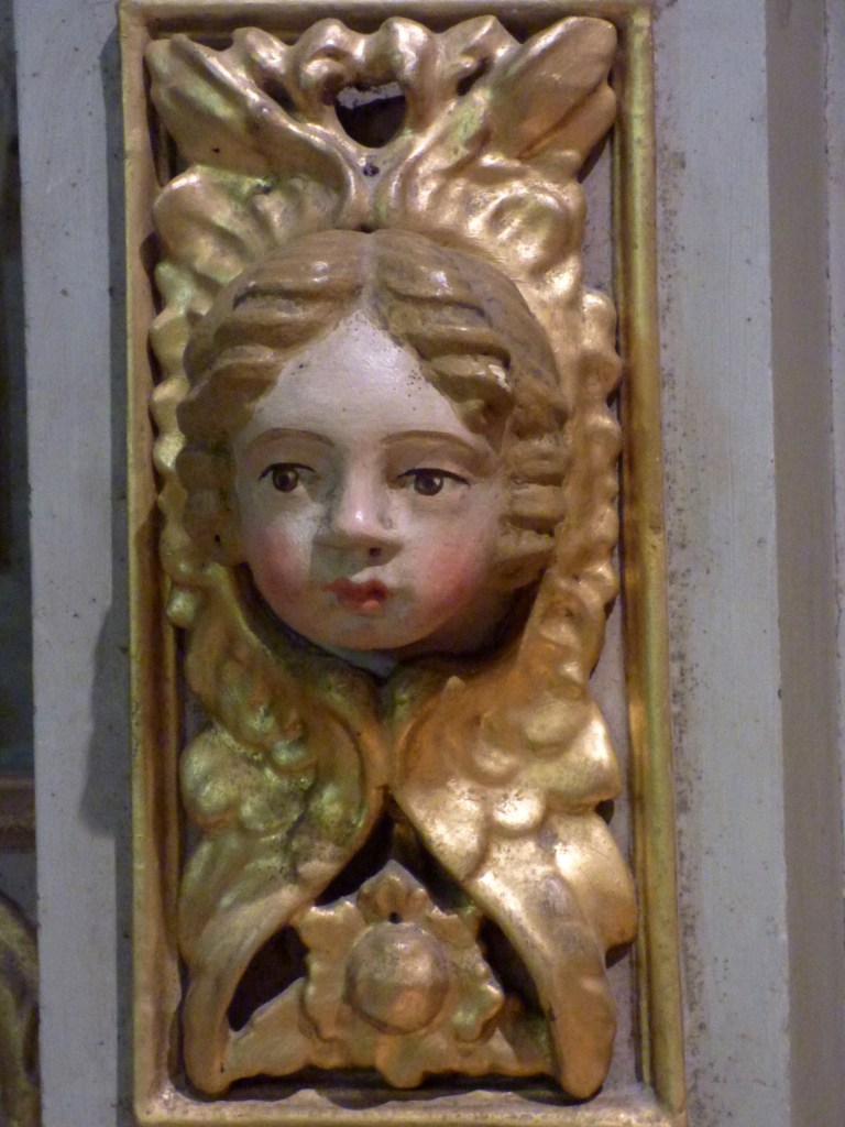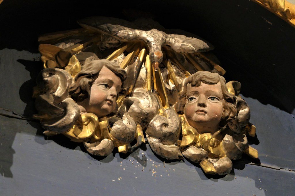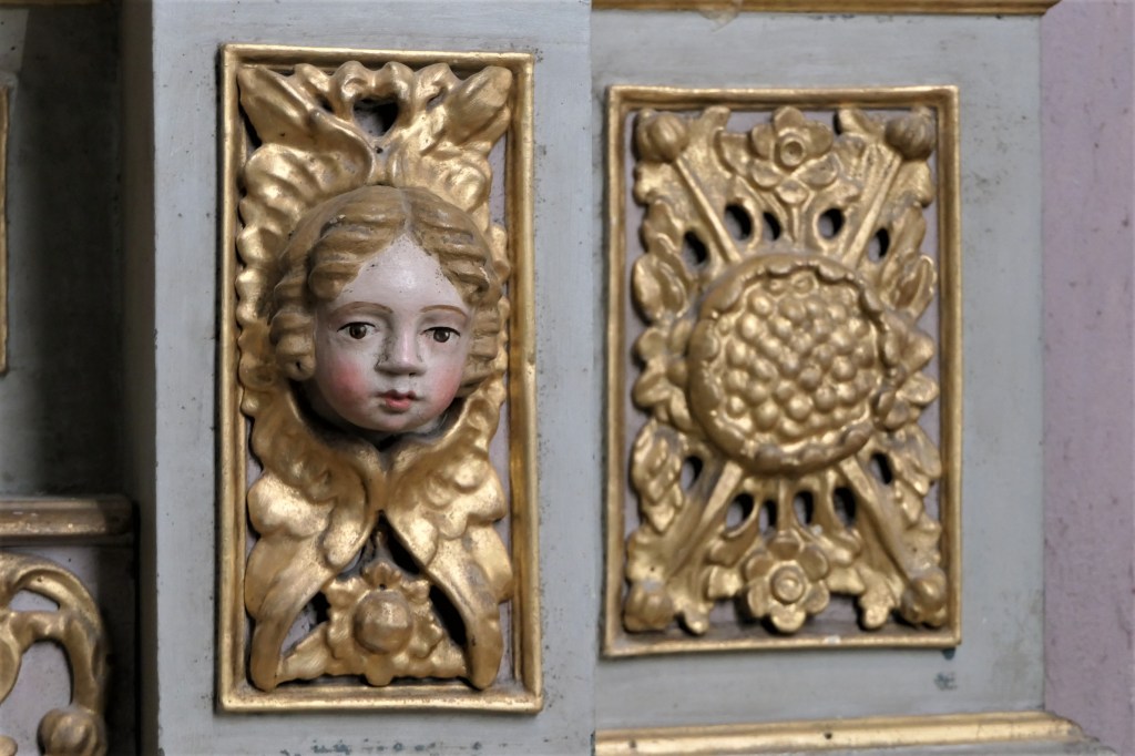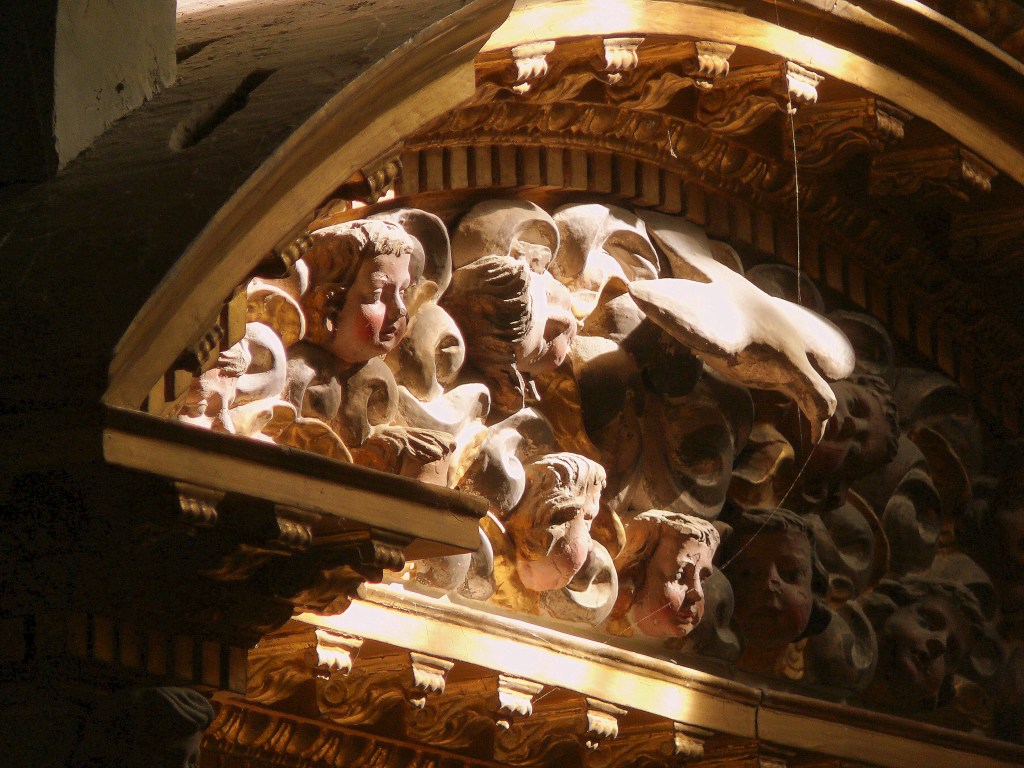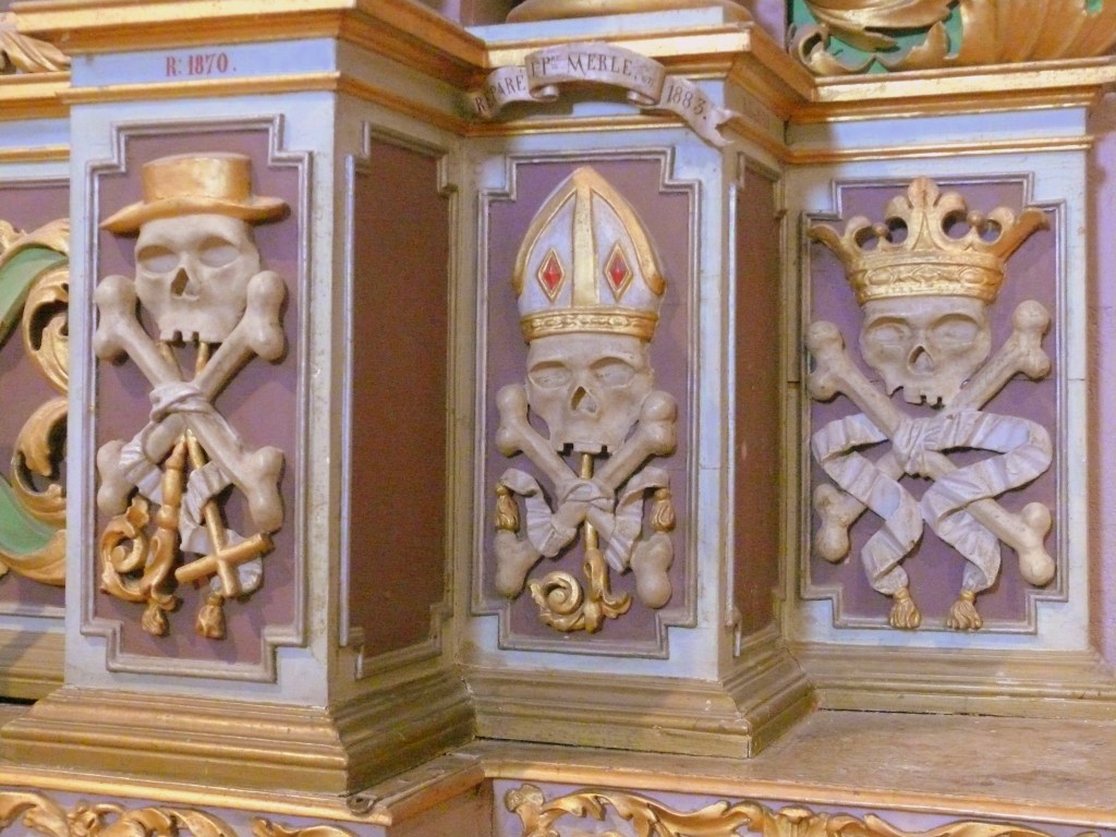 Les panneaux sculptés avec des têtes de morts coiffées (tiare du pape, mitre de l’évêque, couronnes royale, comtale et ducale, chapeau de cardinal) rappellent l’égalité de tous devant la mort.