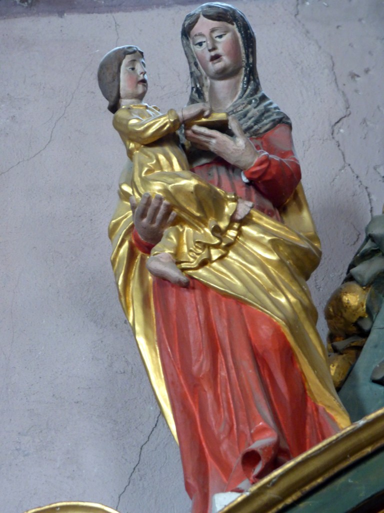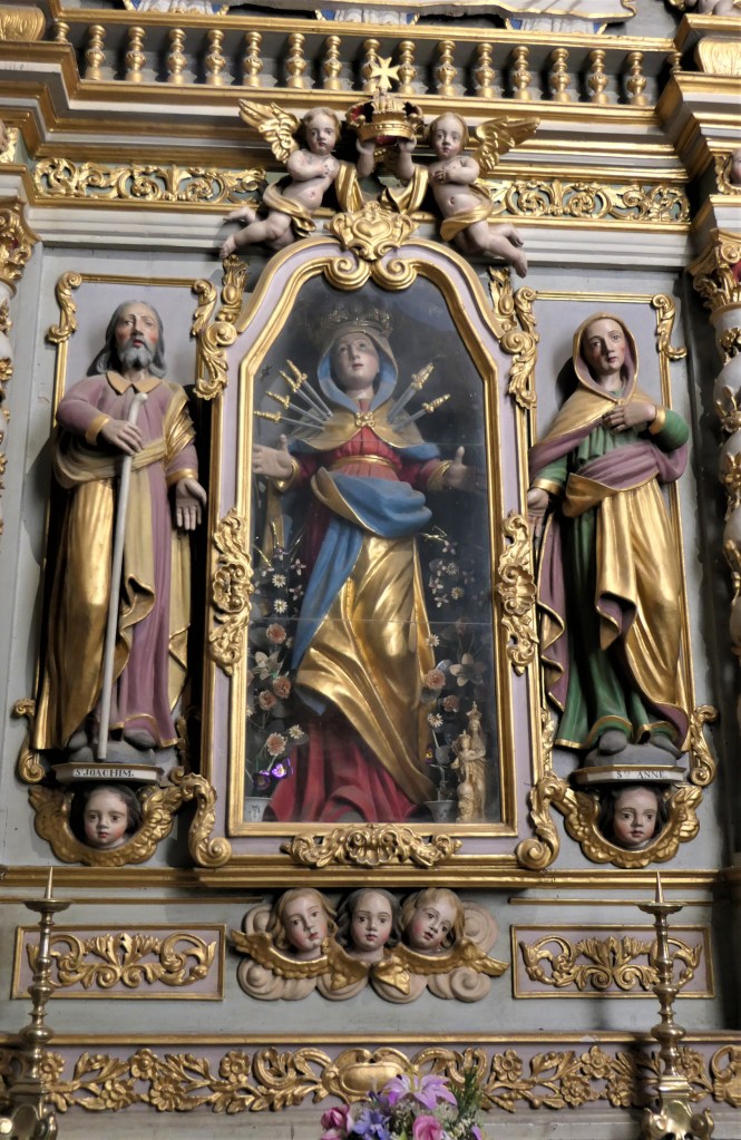 La vierge y est représentée entourée de ses parents, Sainte Anne et saint Joachim.