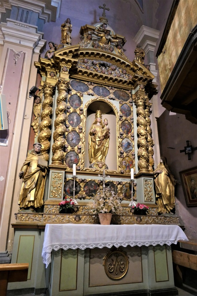 Offert en 1690 en ex-voto par le curé de Peisey Jean-Pierre Marion. Ce retable et sa dédicace ont été choisi pour perpétuer le souvenir d’une chapelle du 15ième siècle dédiée à la vierge Marie. Vierge triplement couronnée tenant d’un bras Jésus, la colombe du St Esprit à la main. Une confrérie fondée en 1604 organisait la récitation du rosaire par les jeunes filles du village (150 prières).