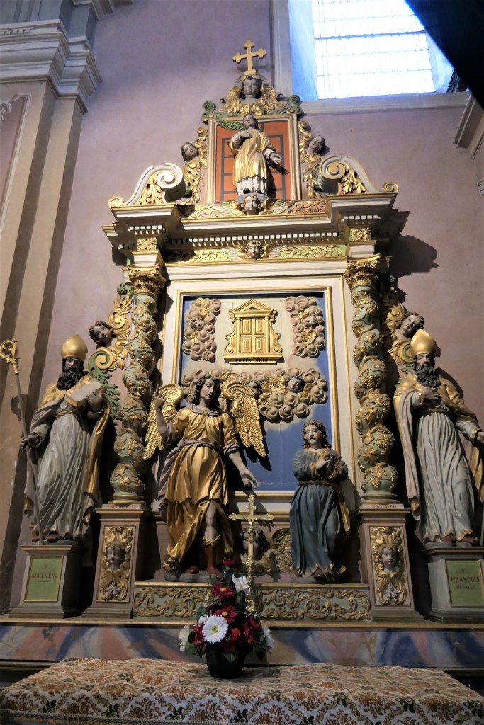 L’autel dédié à Saint Laurent, saint-patron des pauvres, est un don de Laurent Serret fait en 1695. Il représente la porte du paradis, ou porte du ciel, porta coeli. Sur le devant l’archange Raphaël conduit l’enfant Tobie dans le désert. Adroite Saint-François de Sales, A gauche Saint Augustin. En attique : Saint Laurent.Au pinacle : une croix de Saint-Maurice.