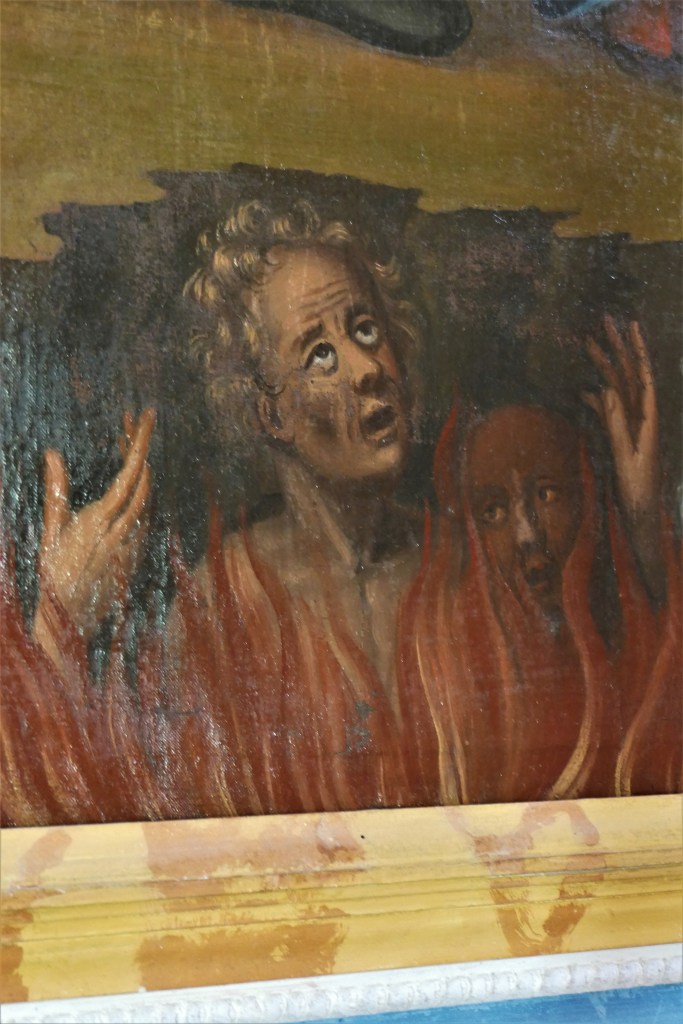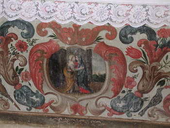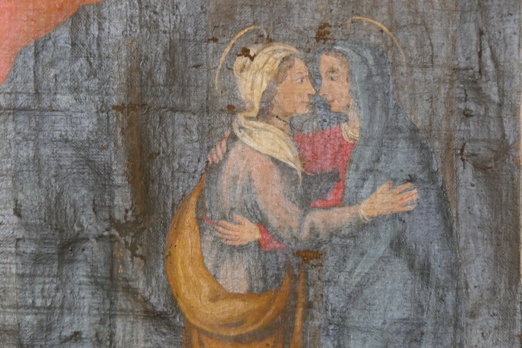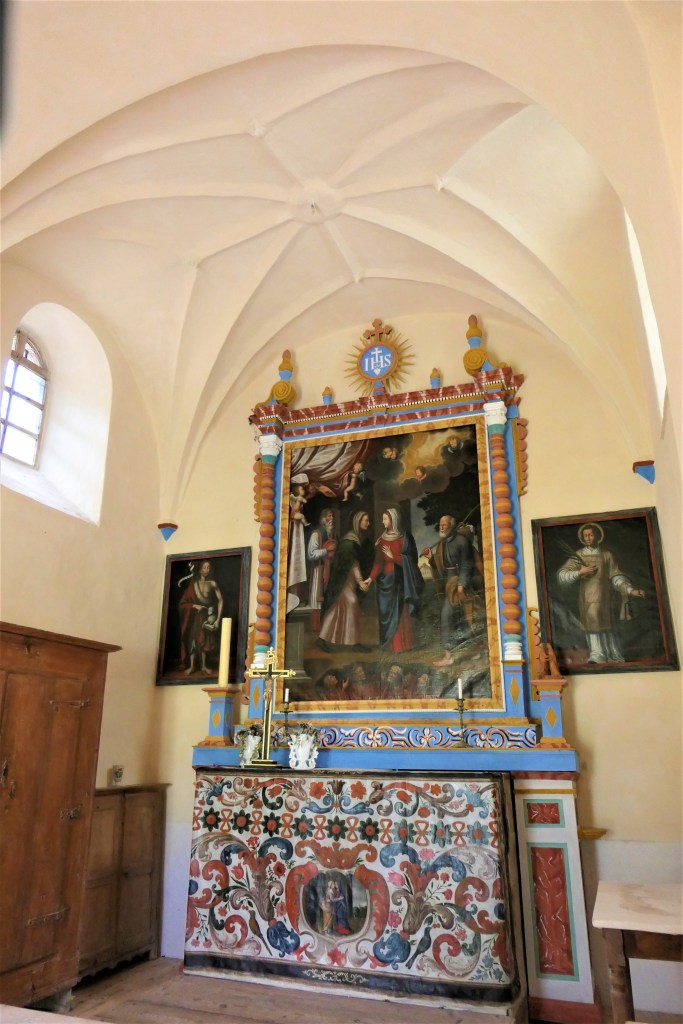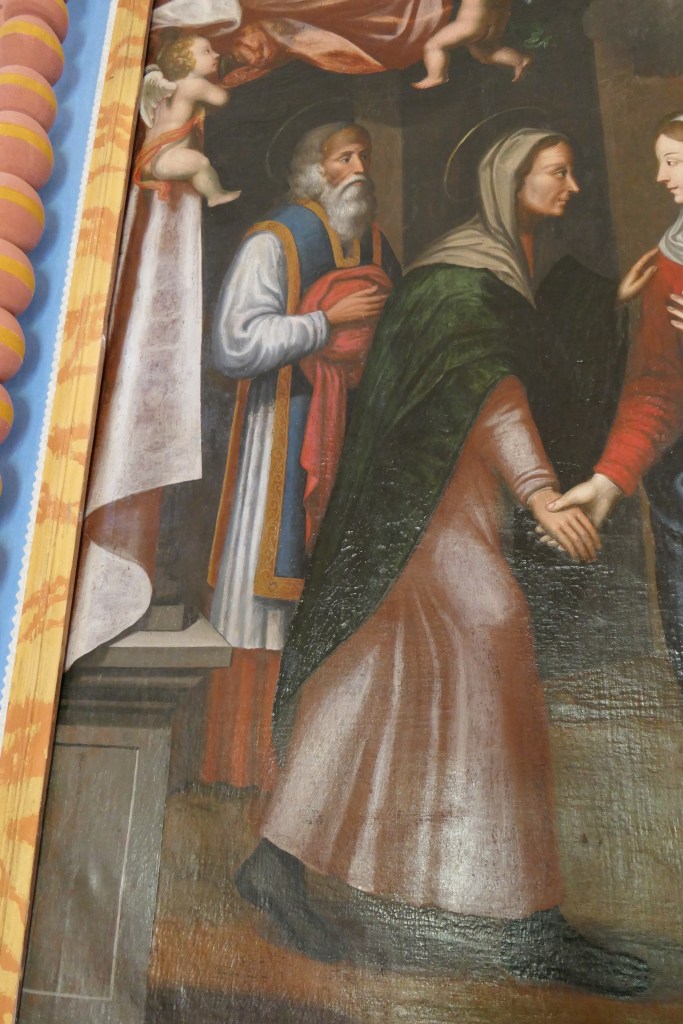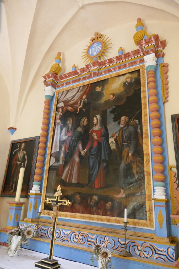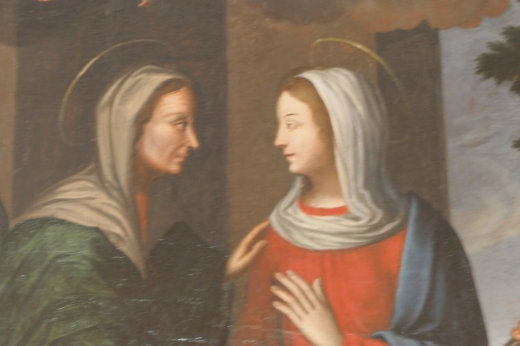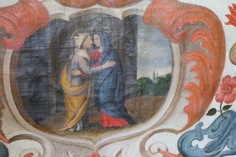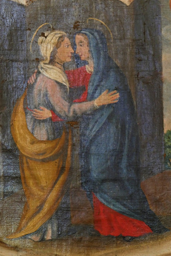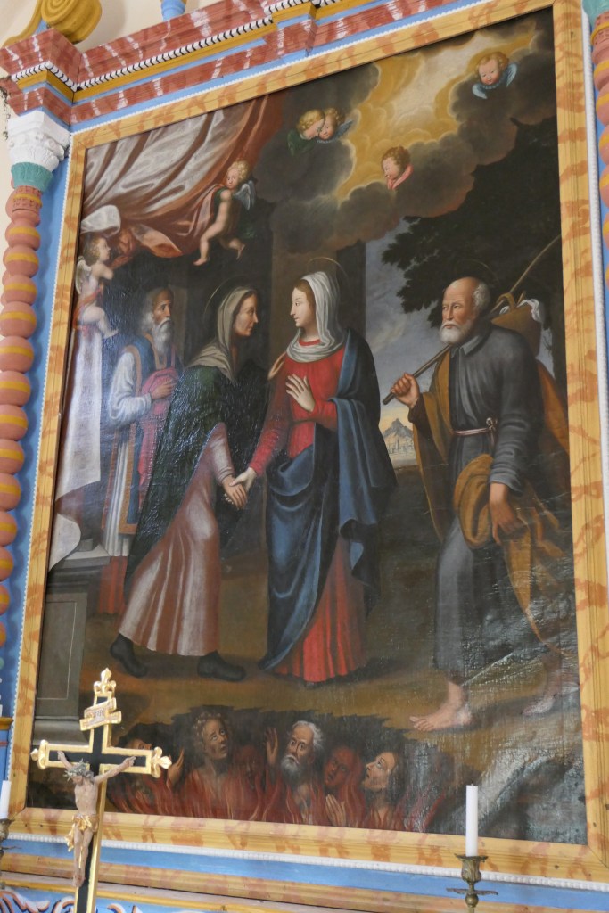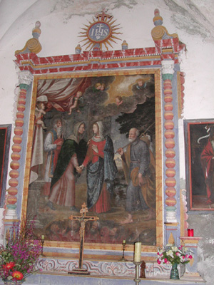 La dédicace de cette chapelle fut à l’origine faite à Notre Dame de la visitation, d’où le thème du tableau. Il semble qu’elle ait glissé vers ND des neiges au milieu du 19ème siècle, date de la création de cette fête par le pape.