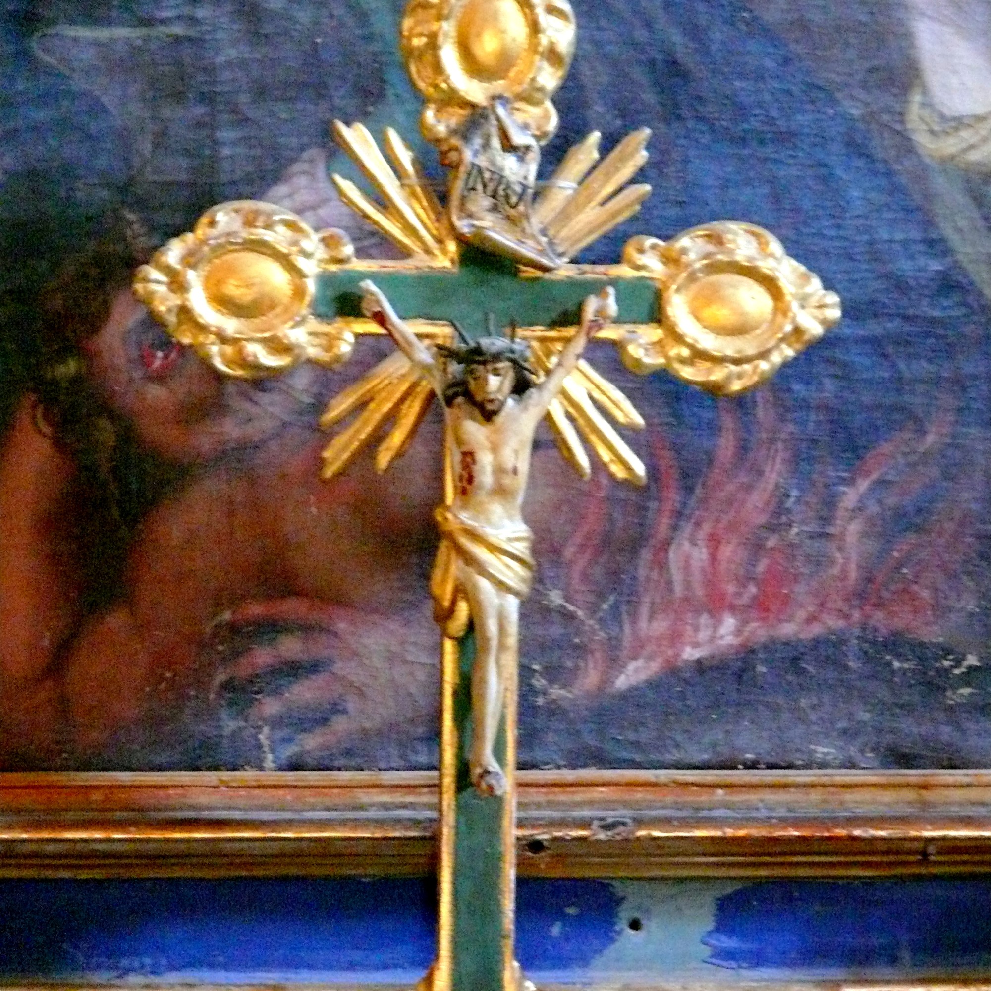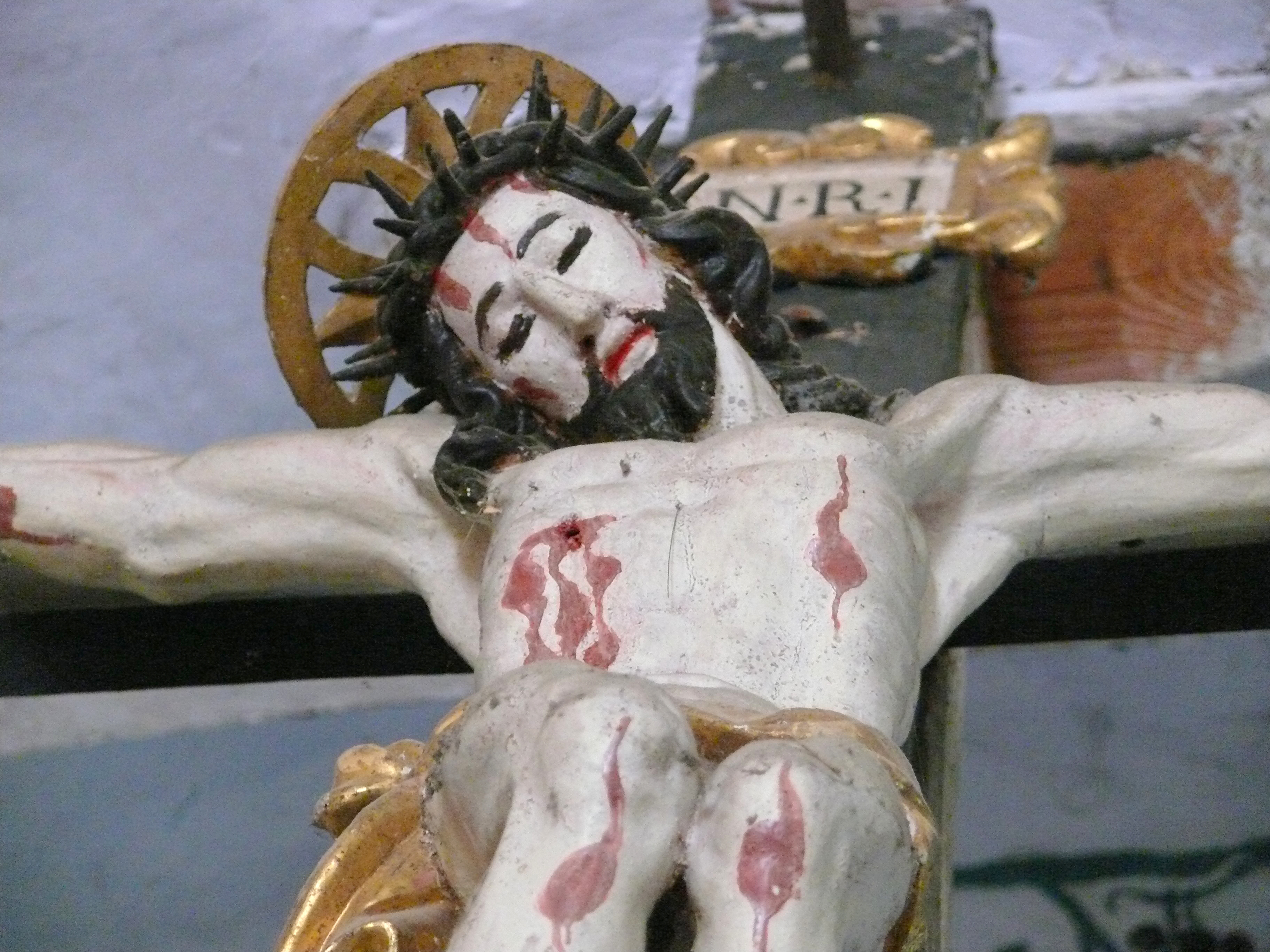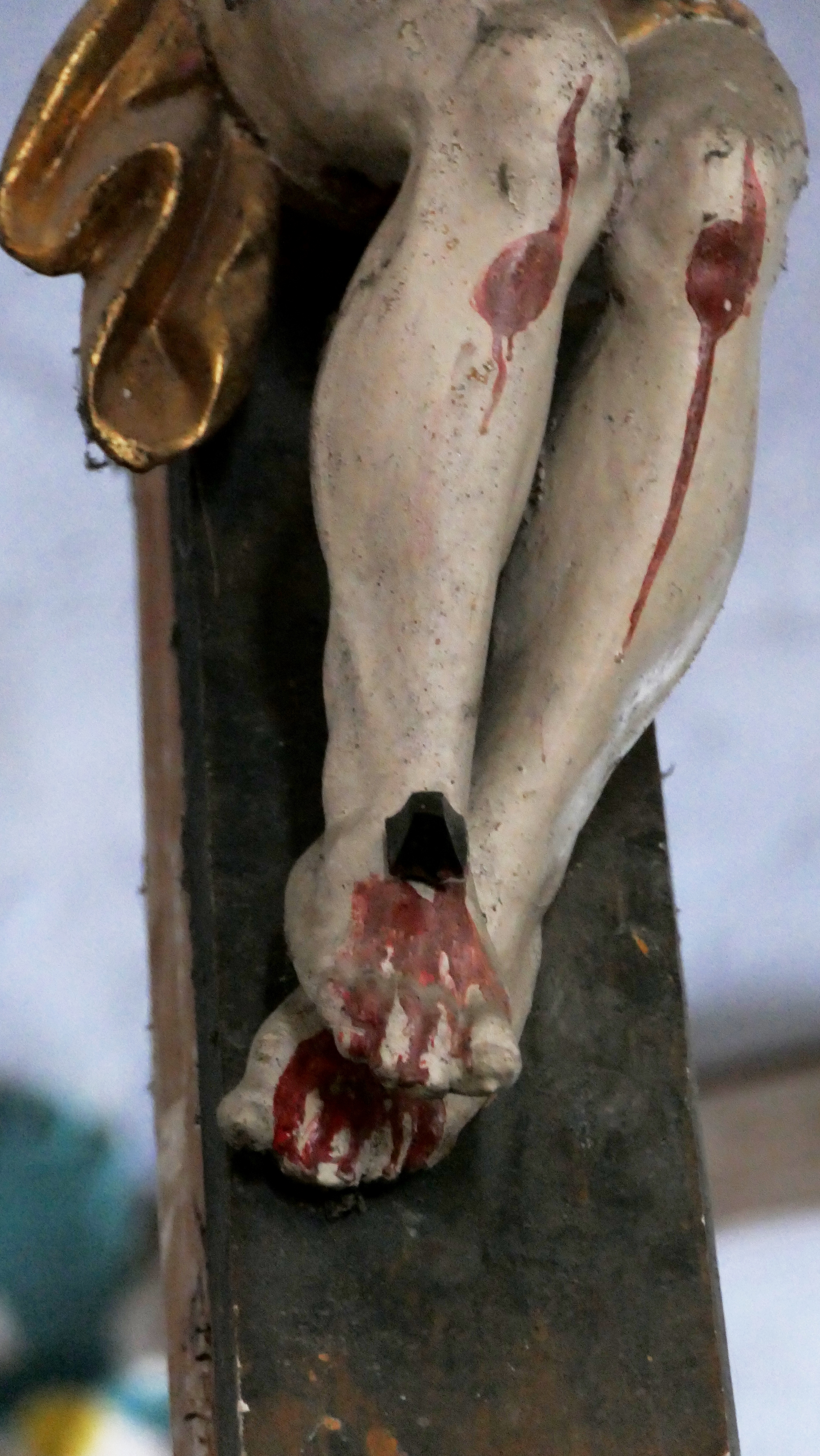 Le crucifié est remarquable. Il est cloué sur une grande croix de procession (on voit encore les barres métalliques permettant de mettre tissus et tentures)