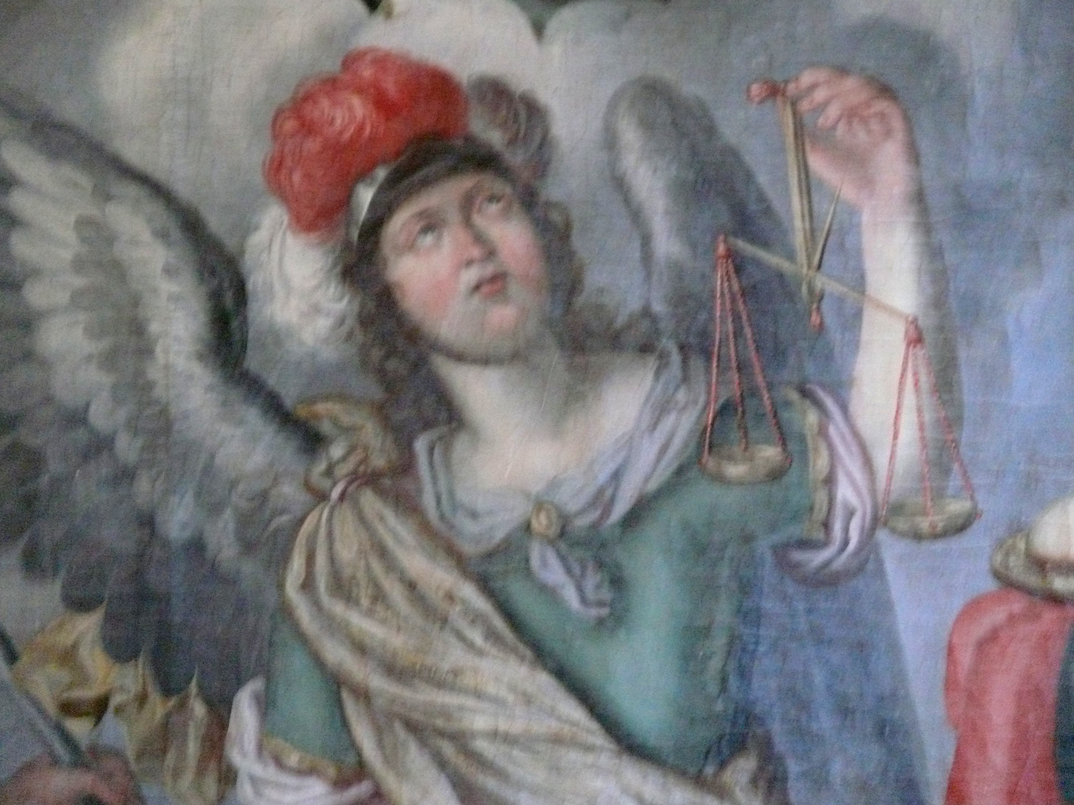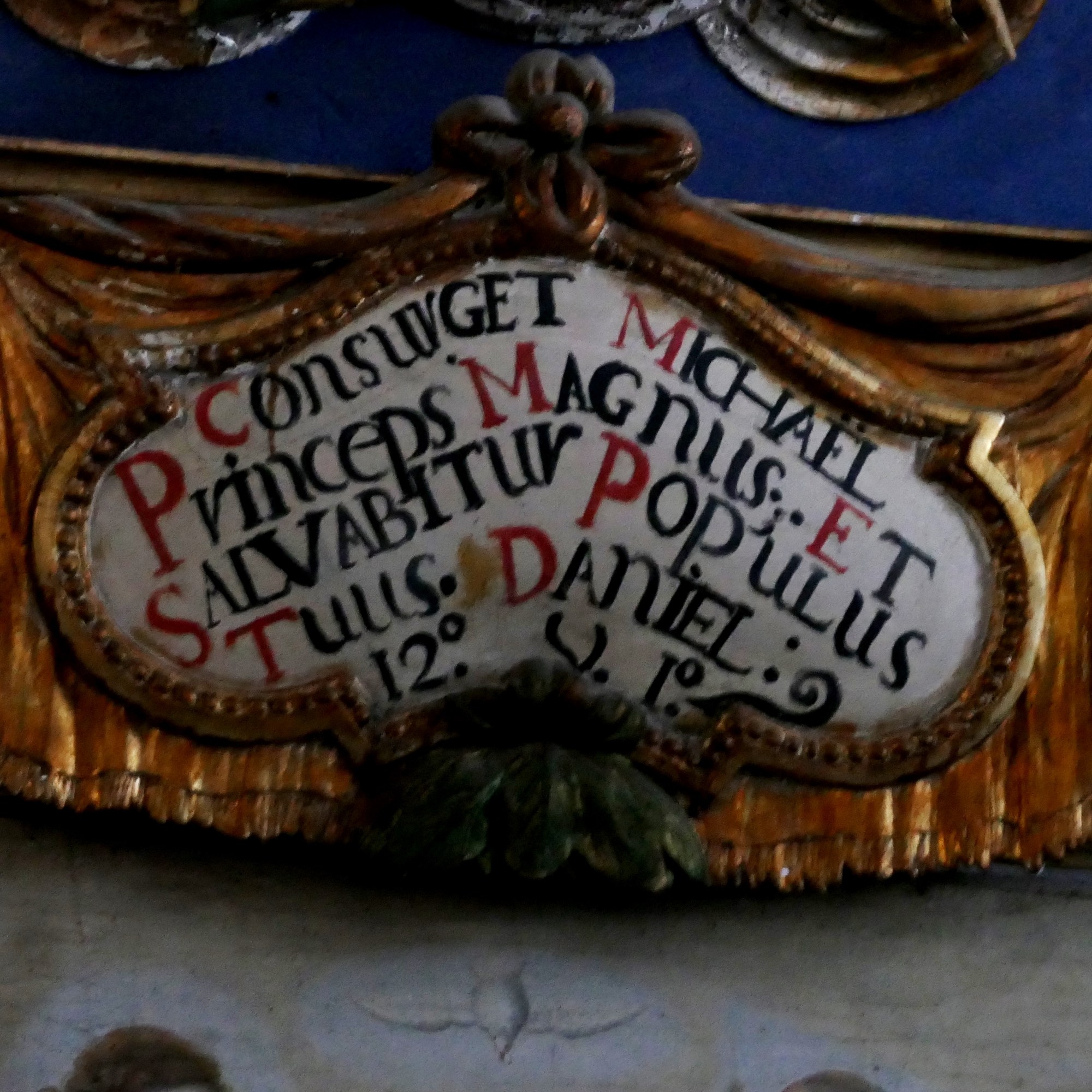 En haut du tableau, un beau cartouche sur draperie dorée avec une inscription latine “Consulget Mickael princeps magnus et salvabitur populus tuus. Daniel 12°” (que se lève le grand prince Michel et ton peuple sera sauvé)