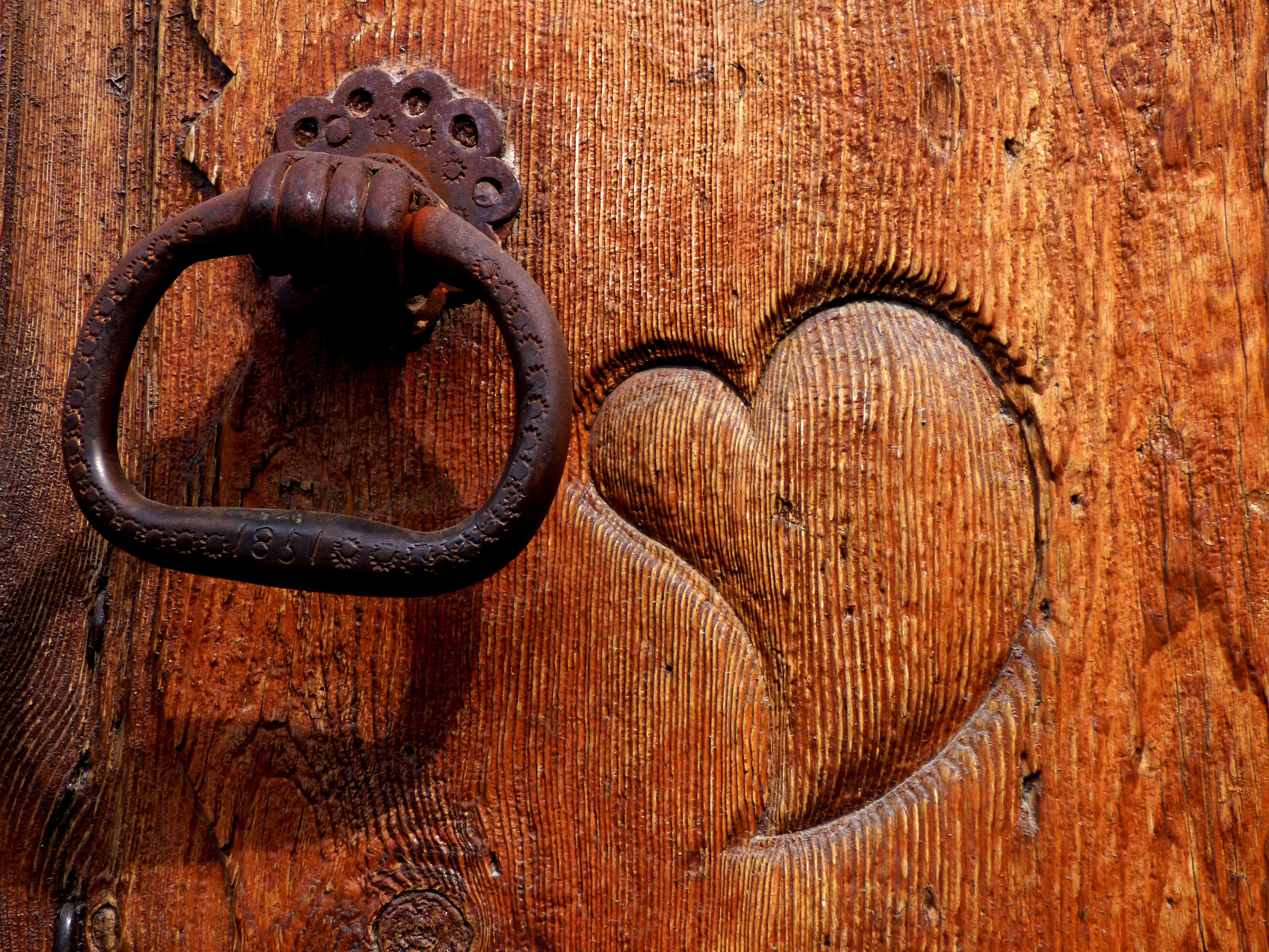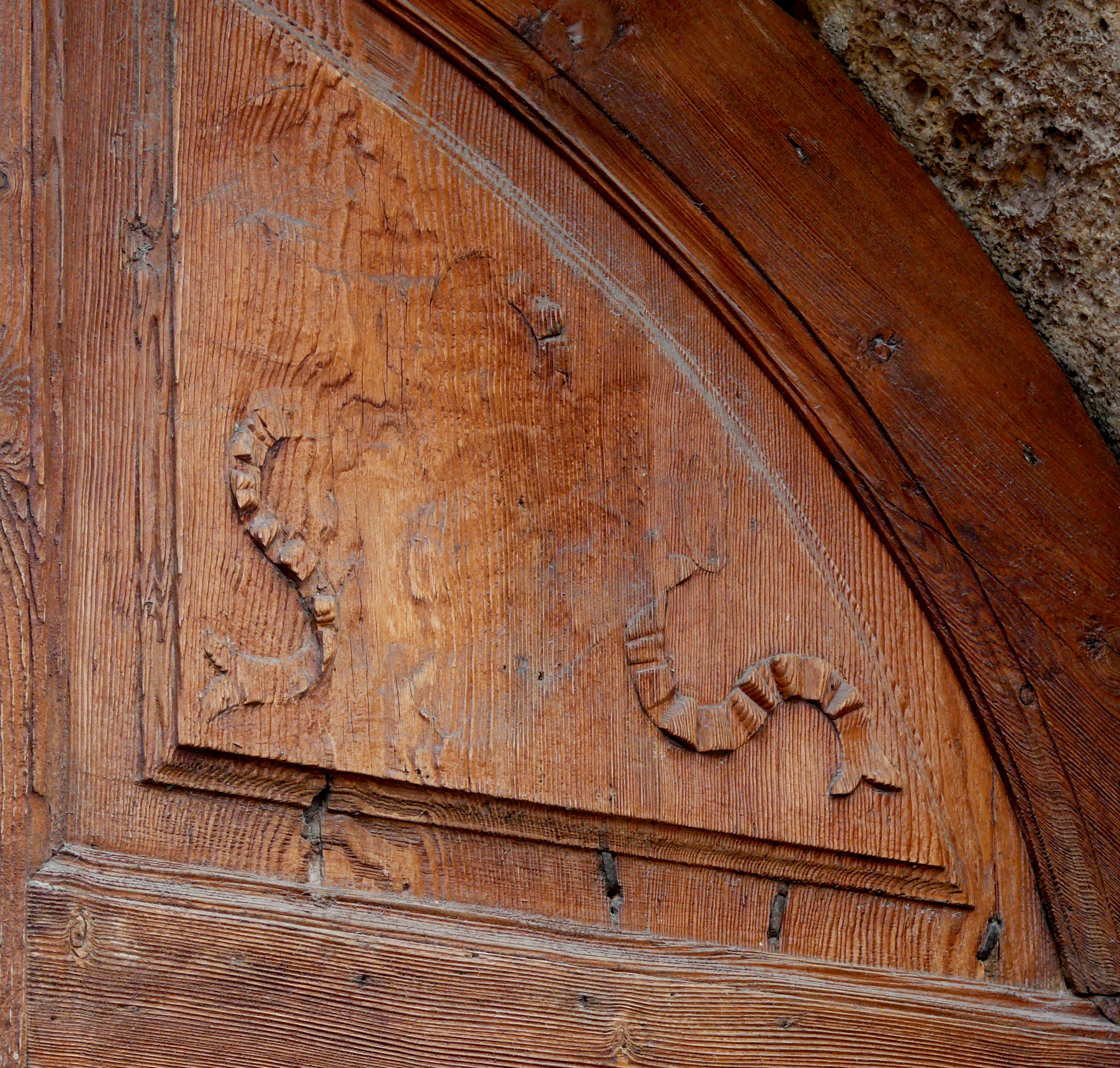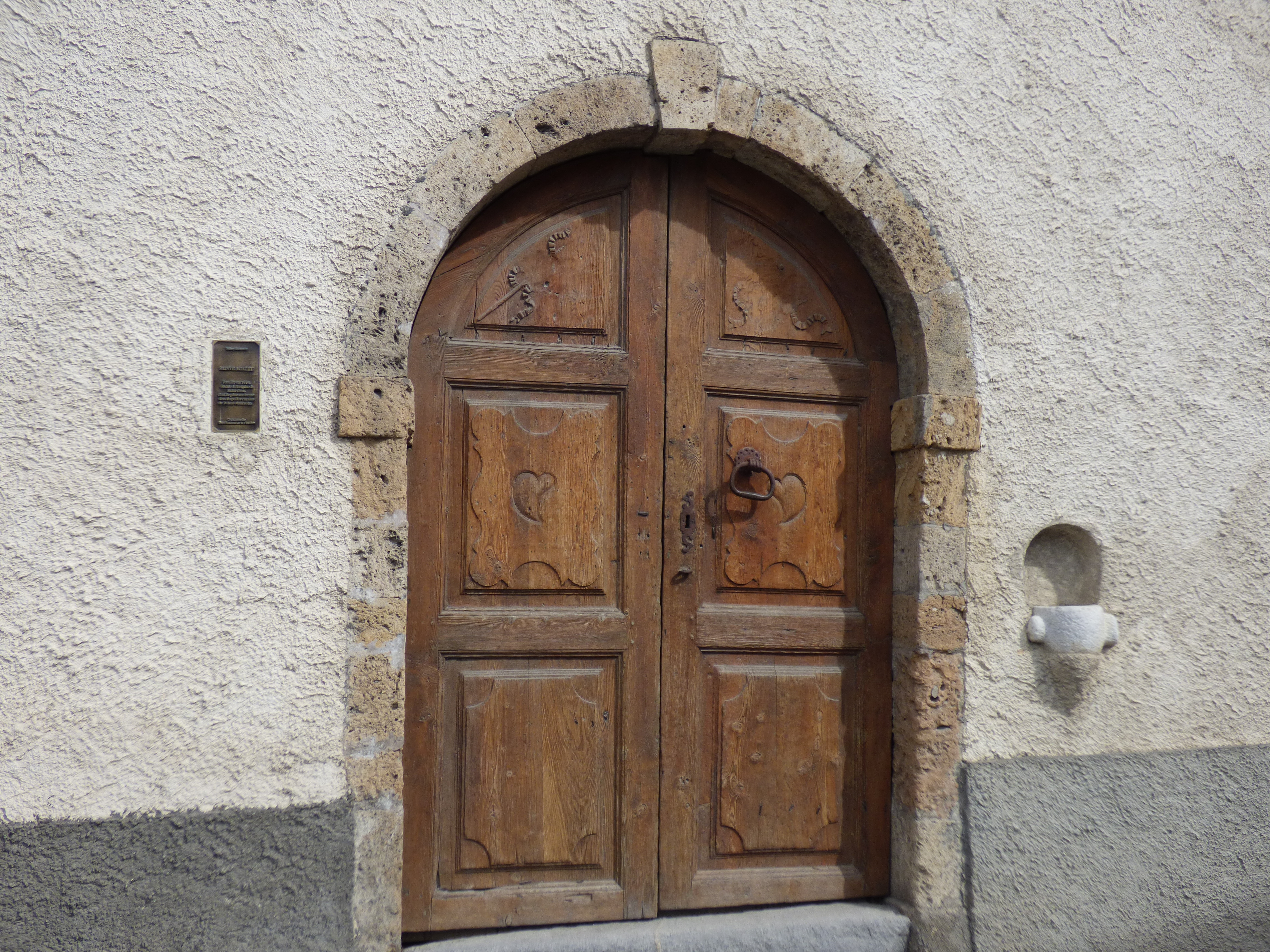 La porte est remarquable , avec les panneaux du haut sculptés de rubans et les panneaux centraux de très jolis coeurs stylisés. La poignée de fer représente une main tenant un anneau gravé d’une frise de petits soleils.