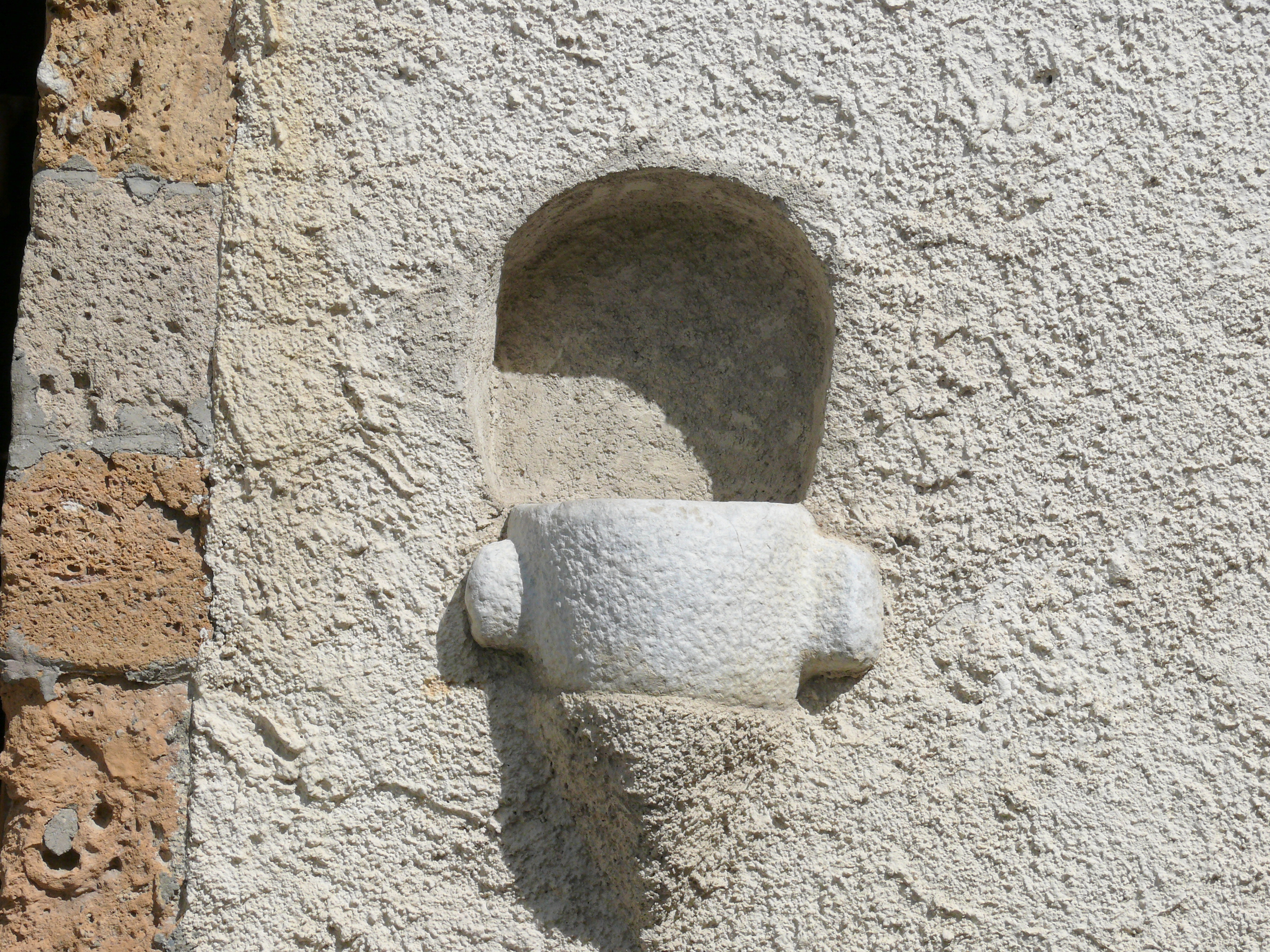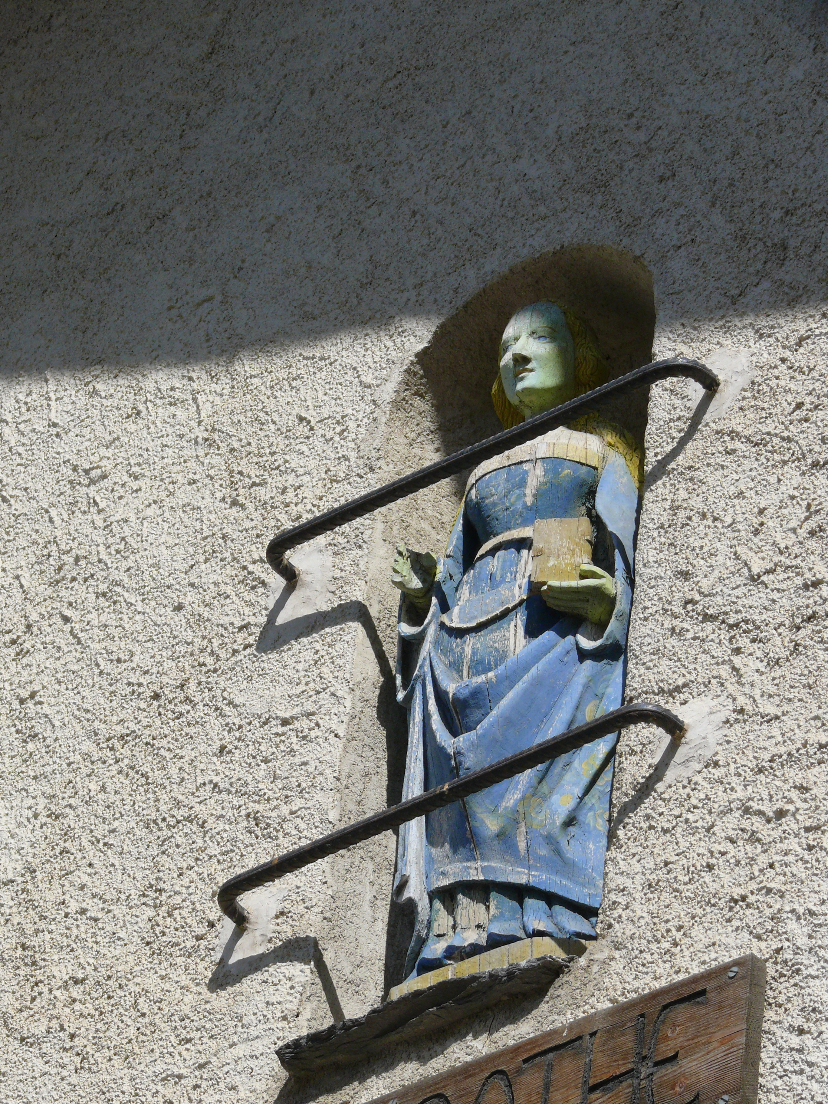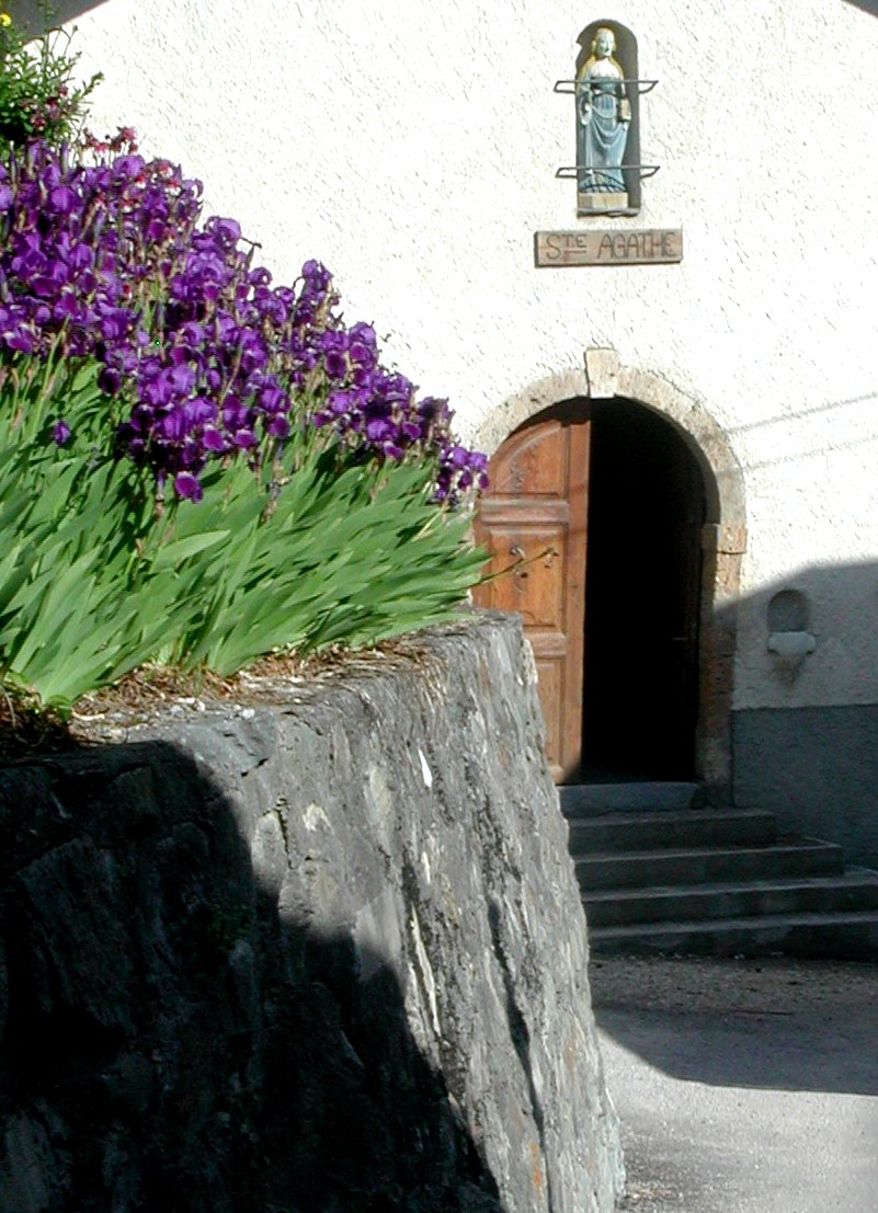 Au dessus de la porte une niche ou la statue de sainte Agathe est retenue de tomber par 2 barres métalliques. La sainte, portant une belle robe bleue, tient un livre.