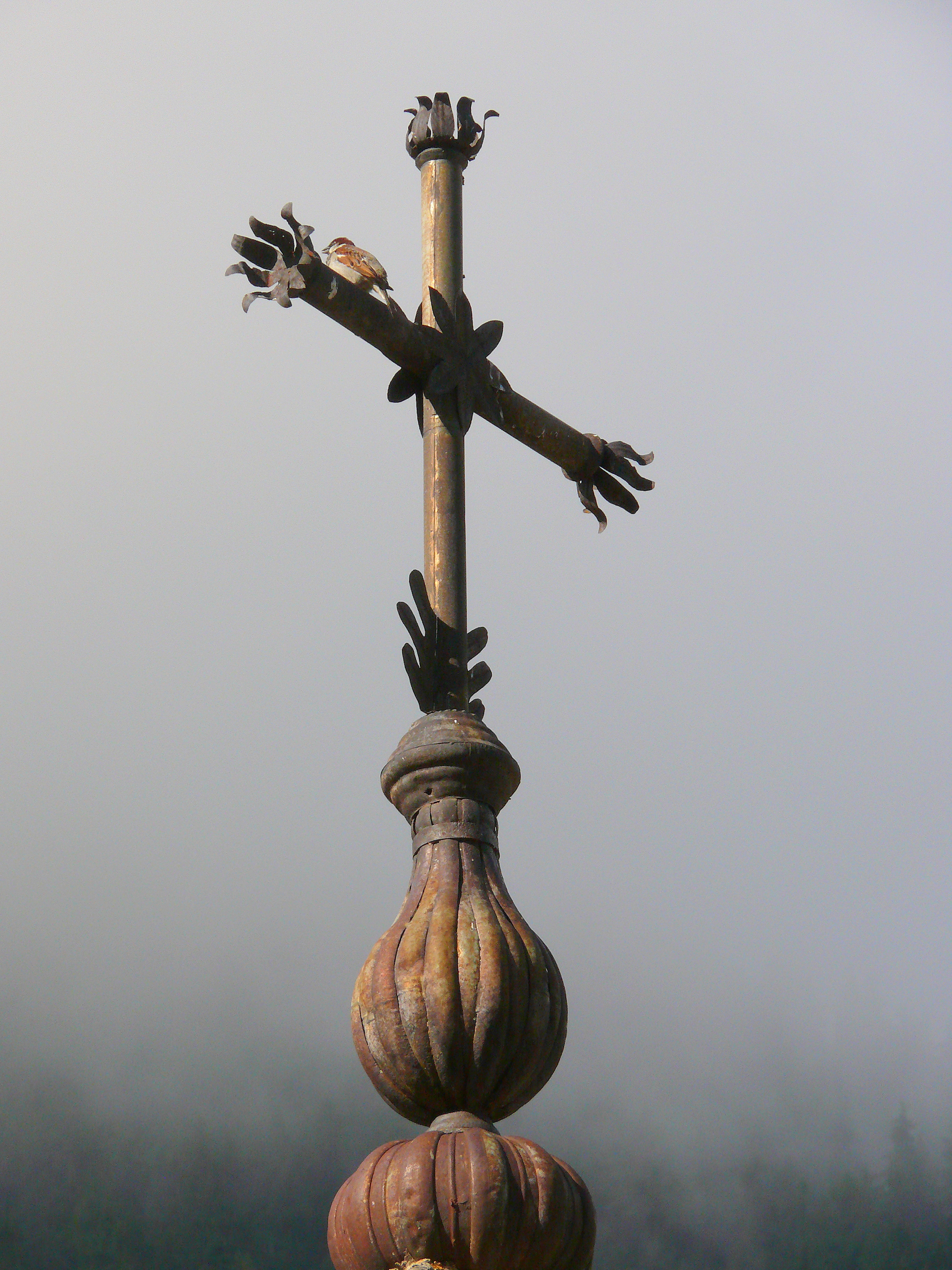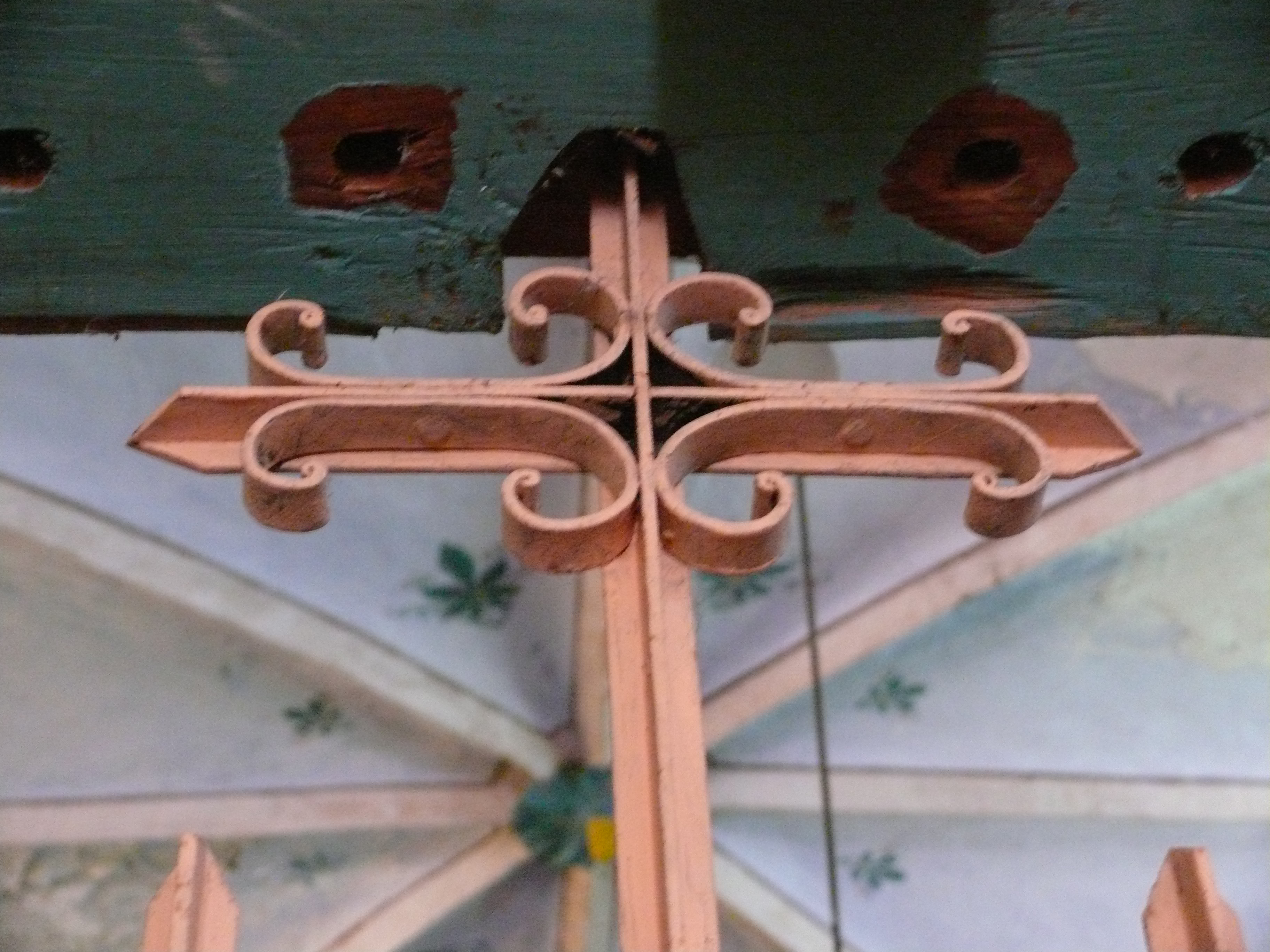 Une croix très ouvragée et peu académique : au dessus d’une petite boule-monde nervurée, une sorte d’oignon-poire, puis la croix, munie d’ailerons, d’une petite gloire, de calices au bout des bras : le tout en ferblanterie.