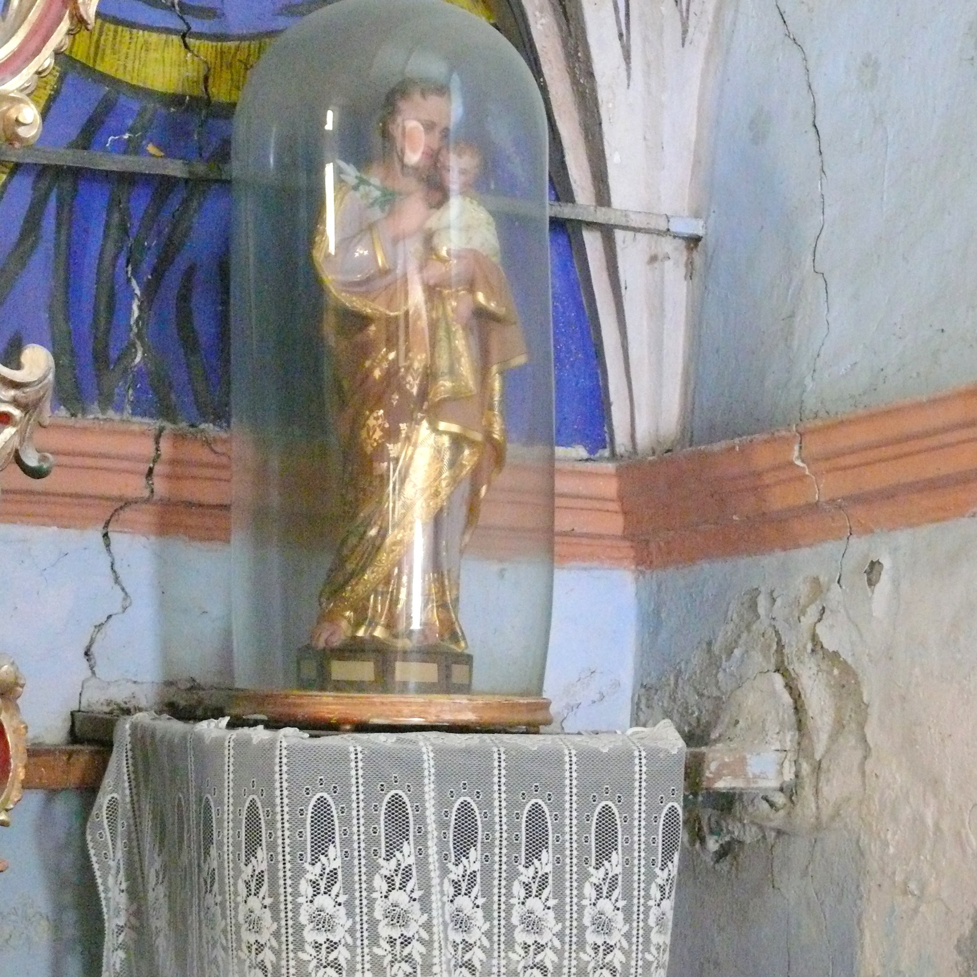 Deux statues à droite et à gauche du retable datent du 19eme siècle, de facture néo-classique sulspicienne. Vitrine ouvragée à gauche : Marie tenant Jésus dans ses bras, St Joseph sous cloche de verre à droite.