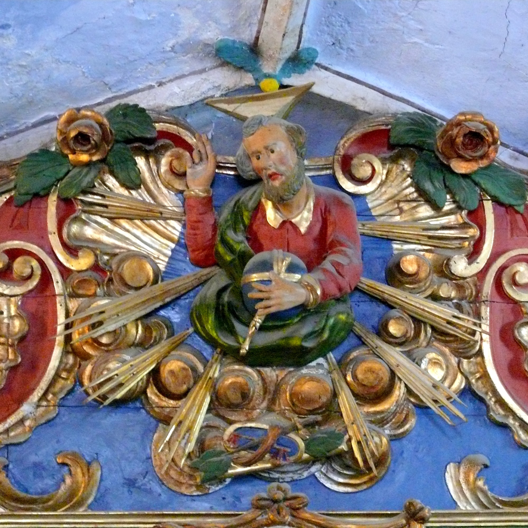 – une trinité “trône de grâce” : Dieu de le père, couronné d’une tiare, assis, tenant devant lui la croix et son crucifié. (Normalement, l’oiseau du St Esprit se trouve sur l’épaule du père, mais il n’y est plus).
