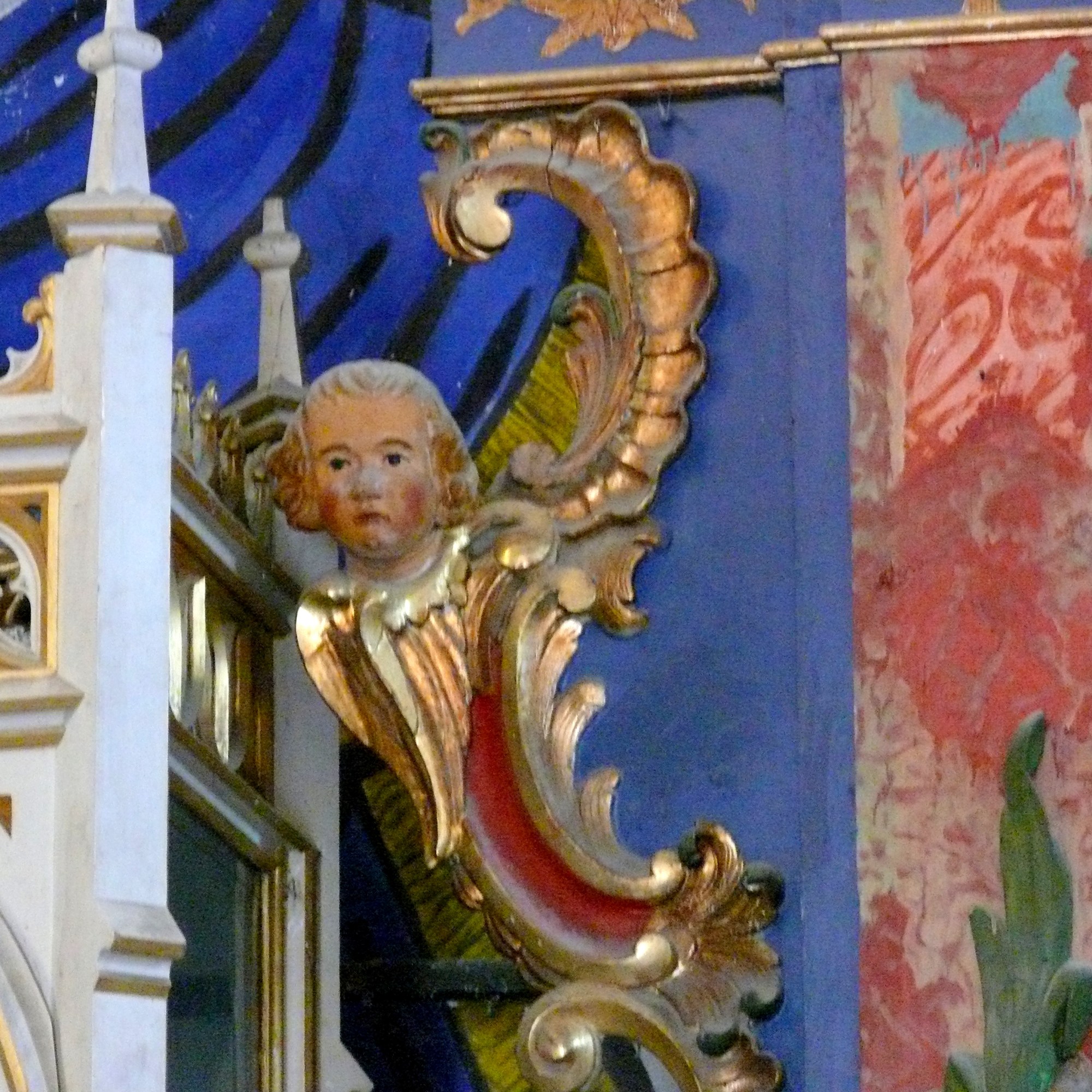 Le retable est constitué d’un tableau dans un cadre très travaillé, avec des anges latéraux à la mine boudeuse, le tout dans les tons rouges et bleus.