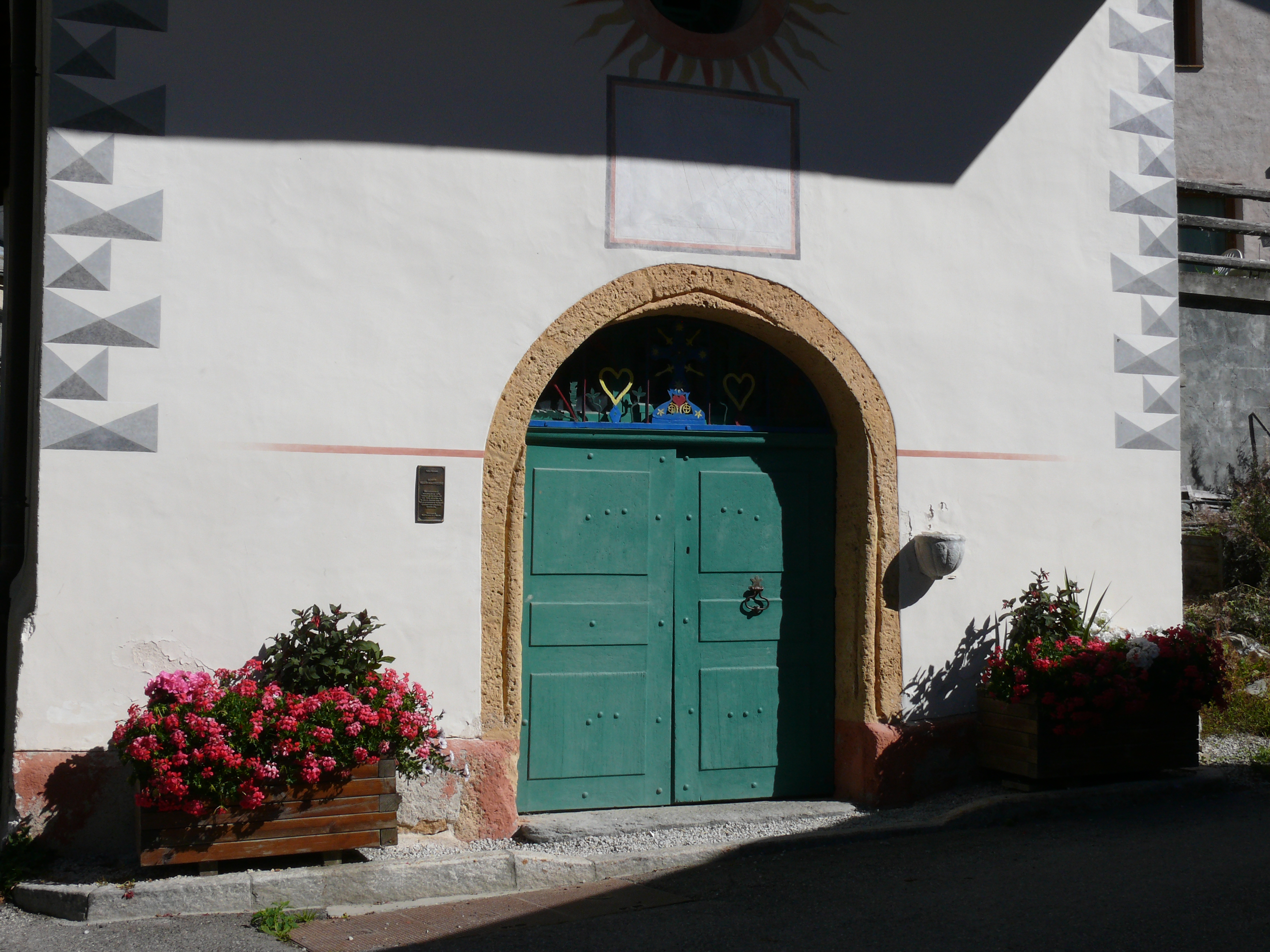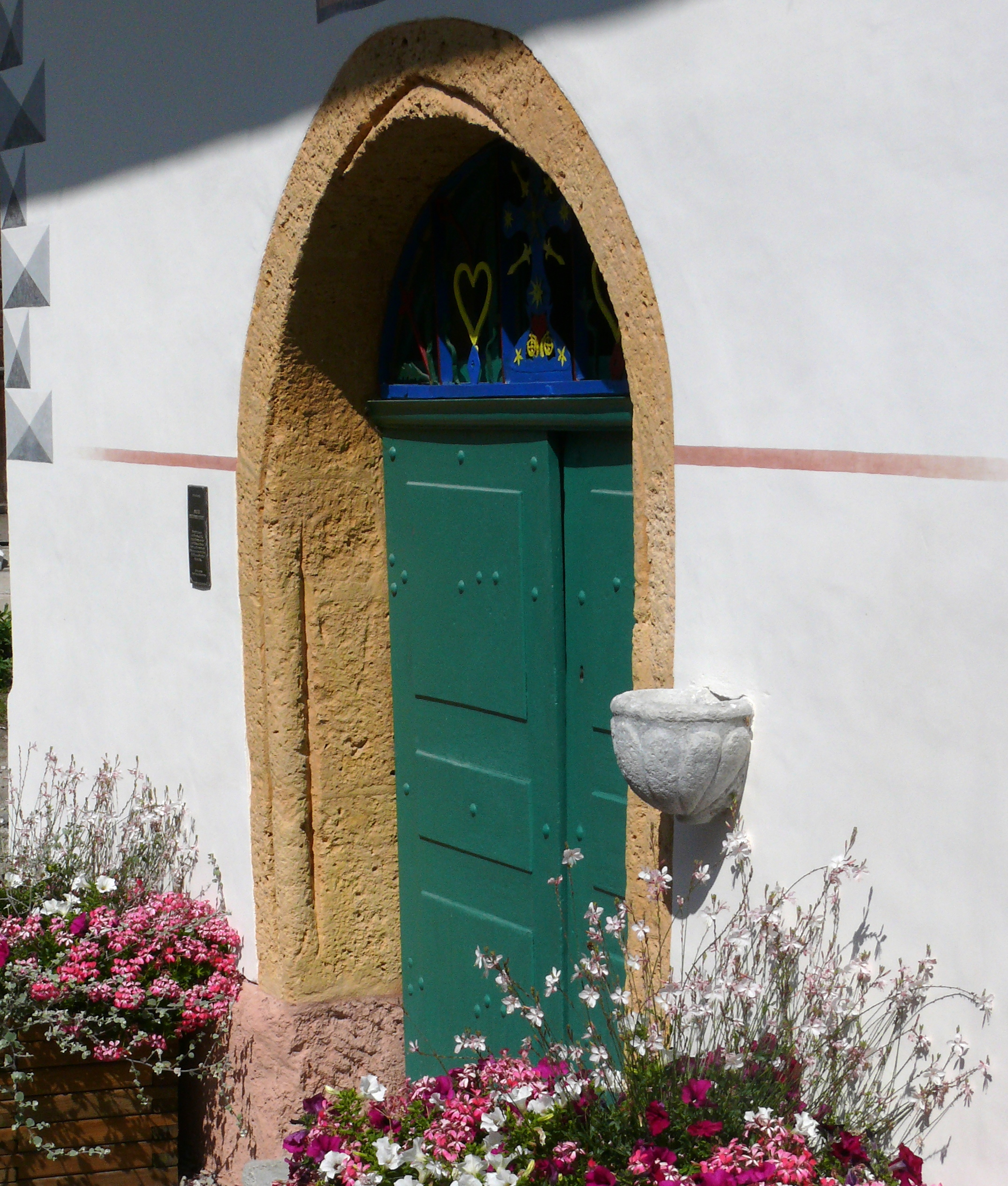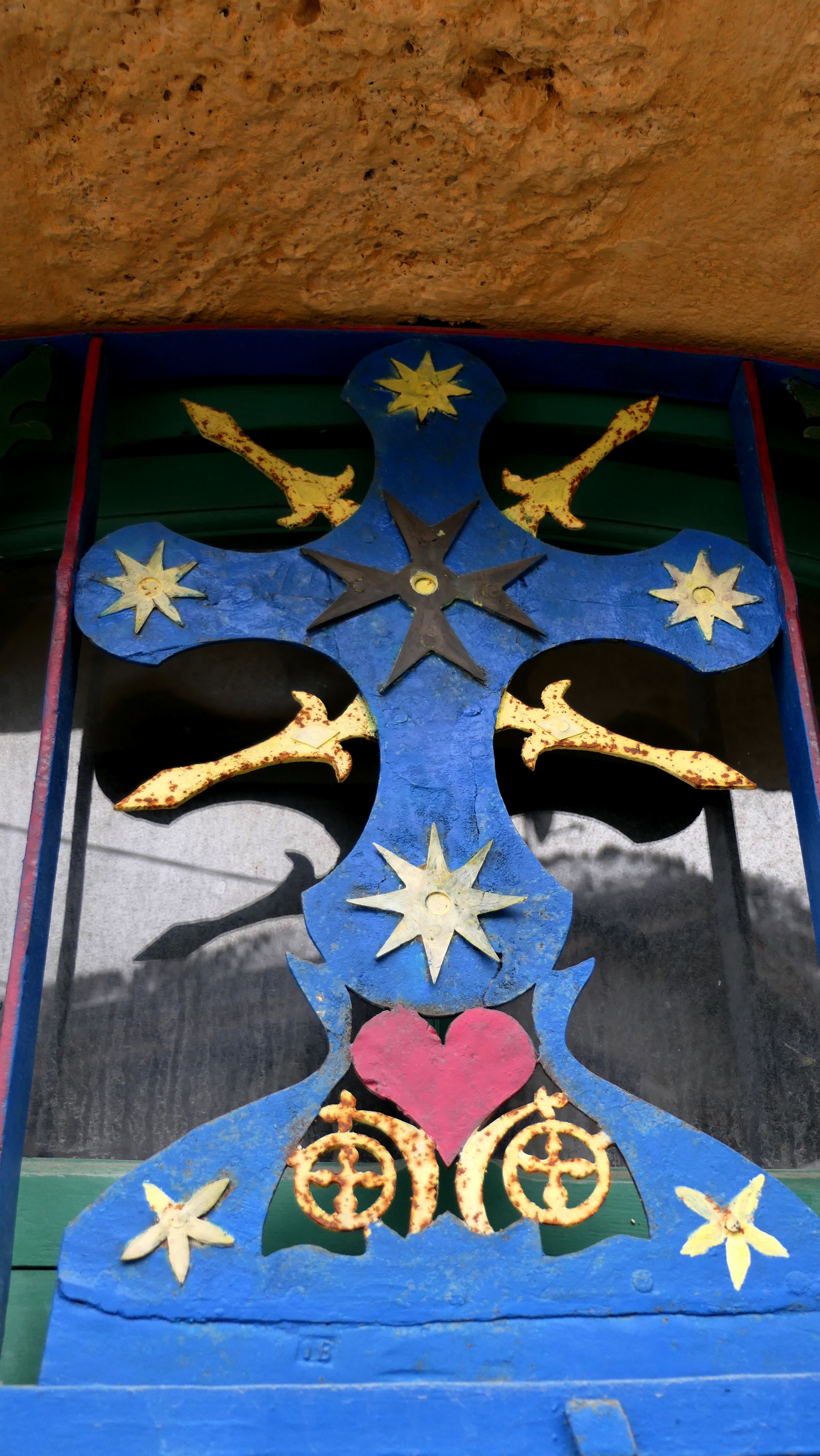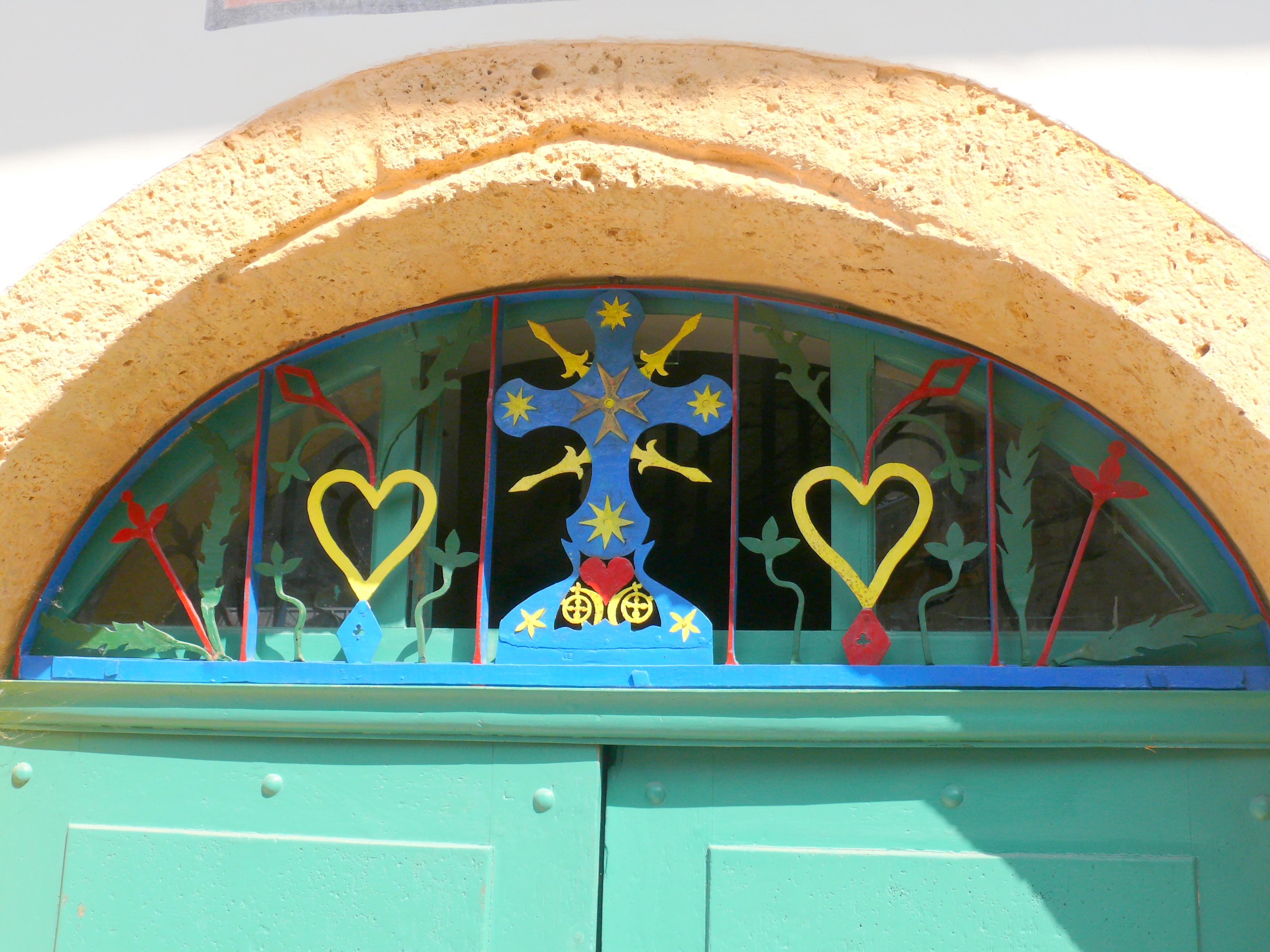 - un porche en voute de plein cintre de tuf. L’imposte, espace en demi-lune au dessus de la porte, est muni d’éléments en ferronnerie colorée : croix avec gloire, motifs floraux, soleils, rosaces et coeurs.