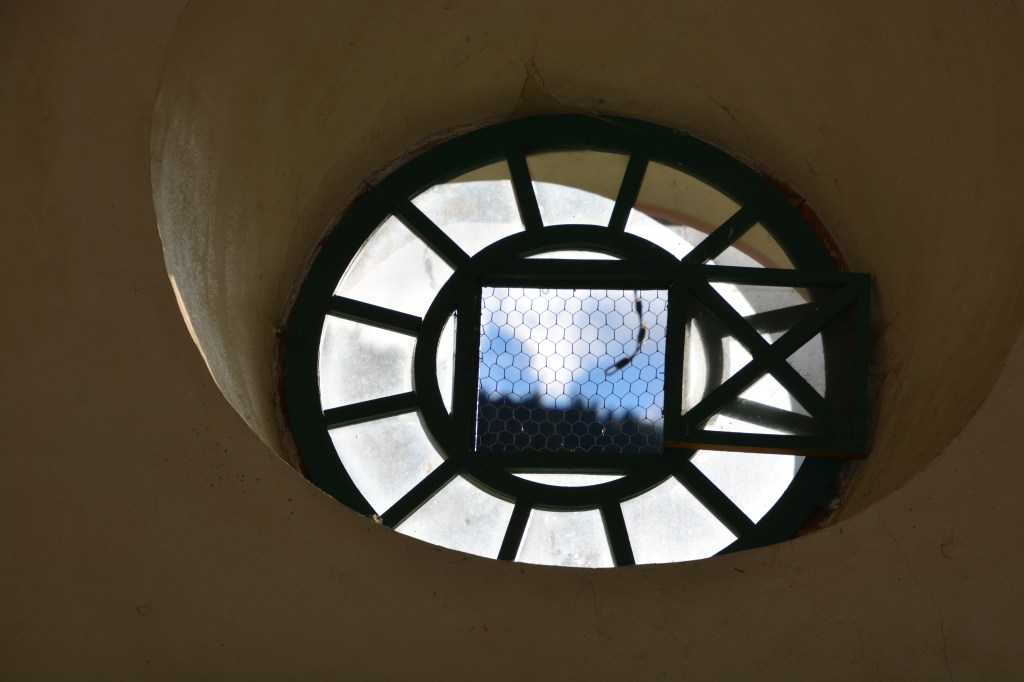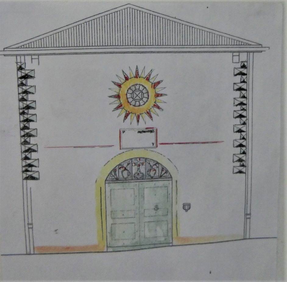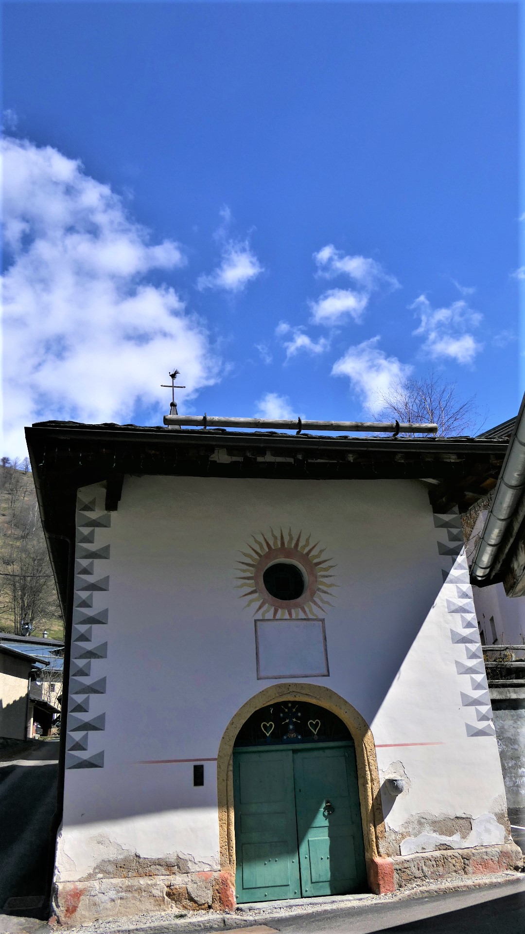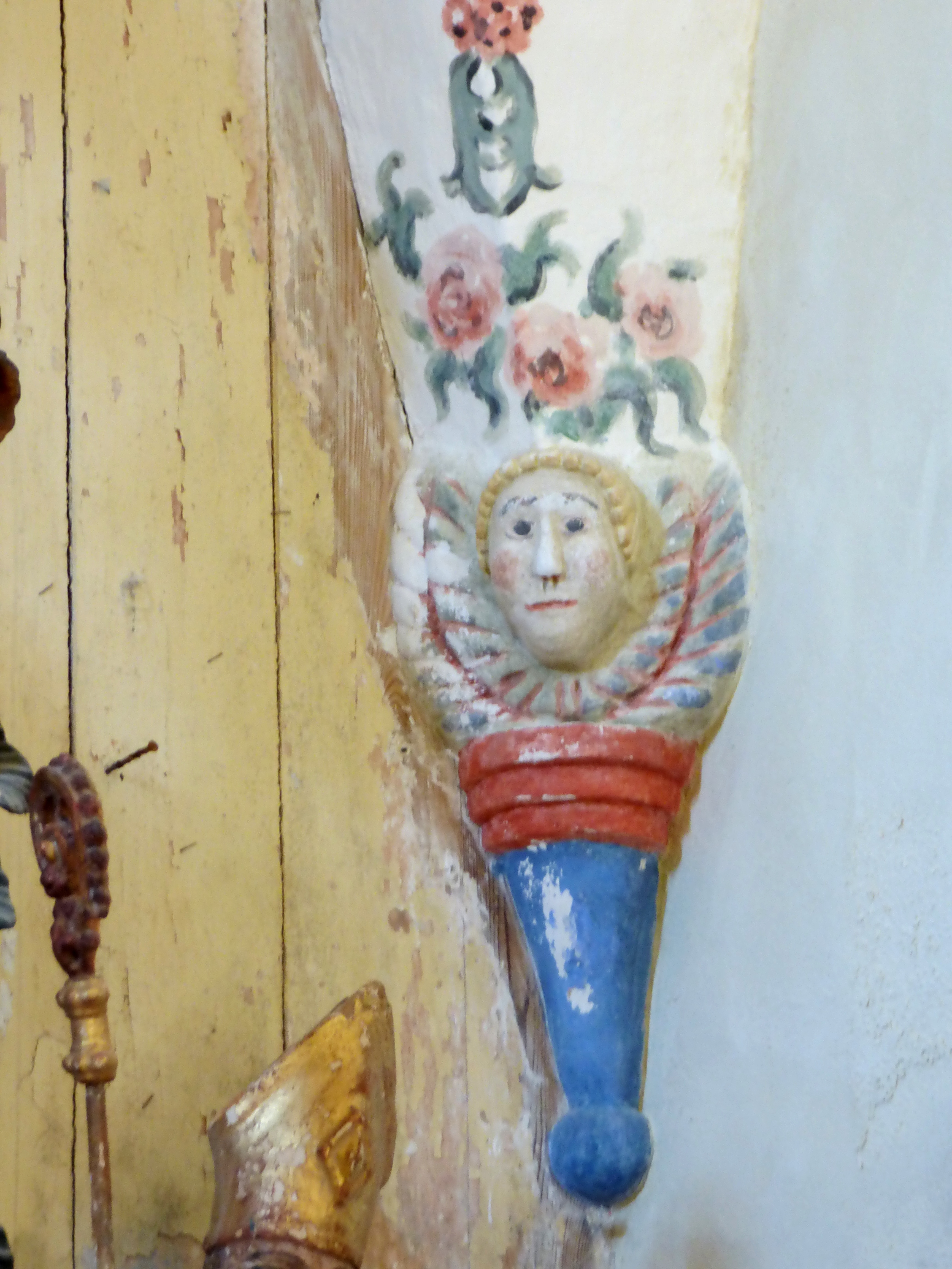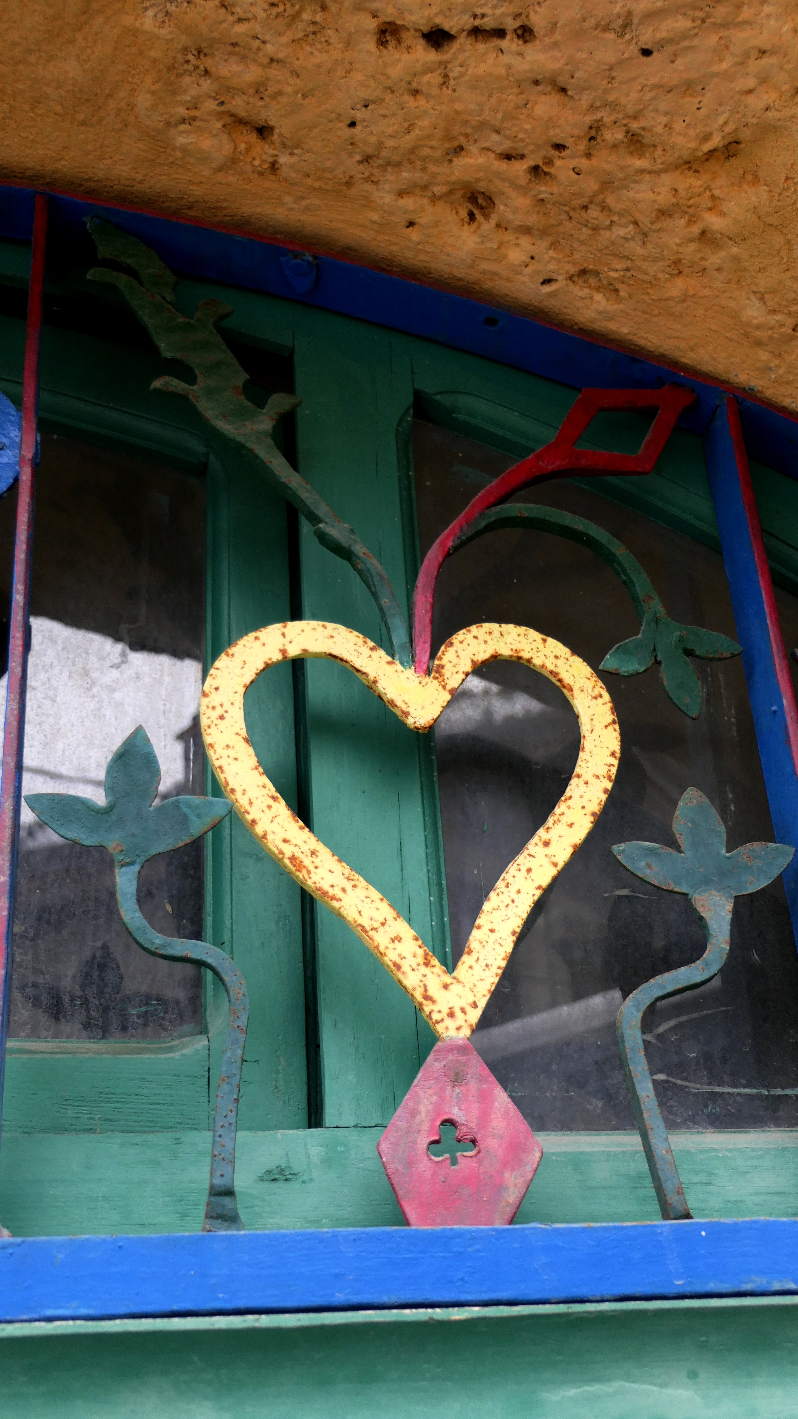 - un porche en voute de plein cintre de tuf. L’imposte, espace en demi-lune au dessus de la porte, est muni d’éléments en ferronnerie colorée : croix avec gloire, motifs floraux, soleils, rosaces et coeurs.