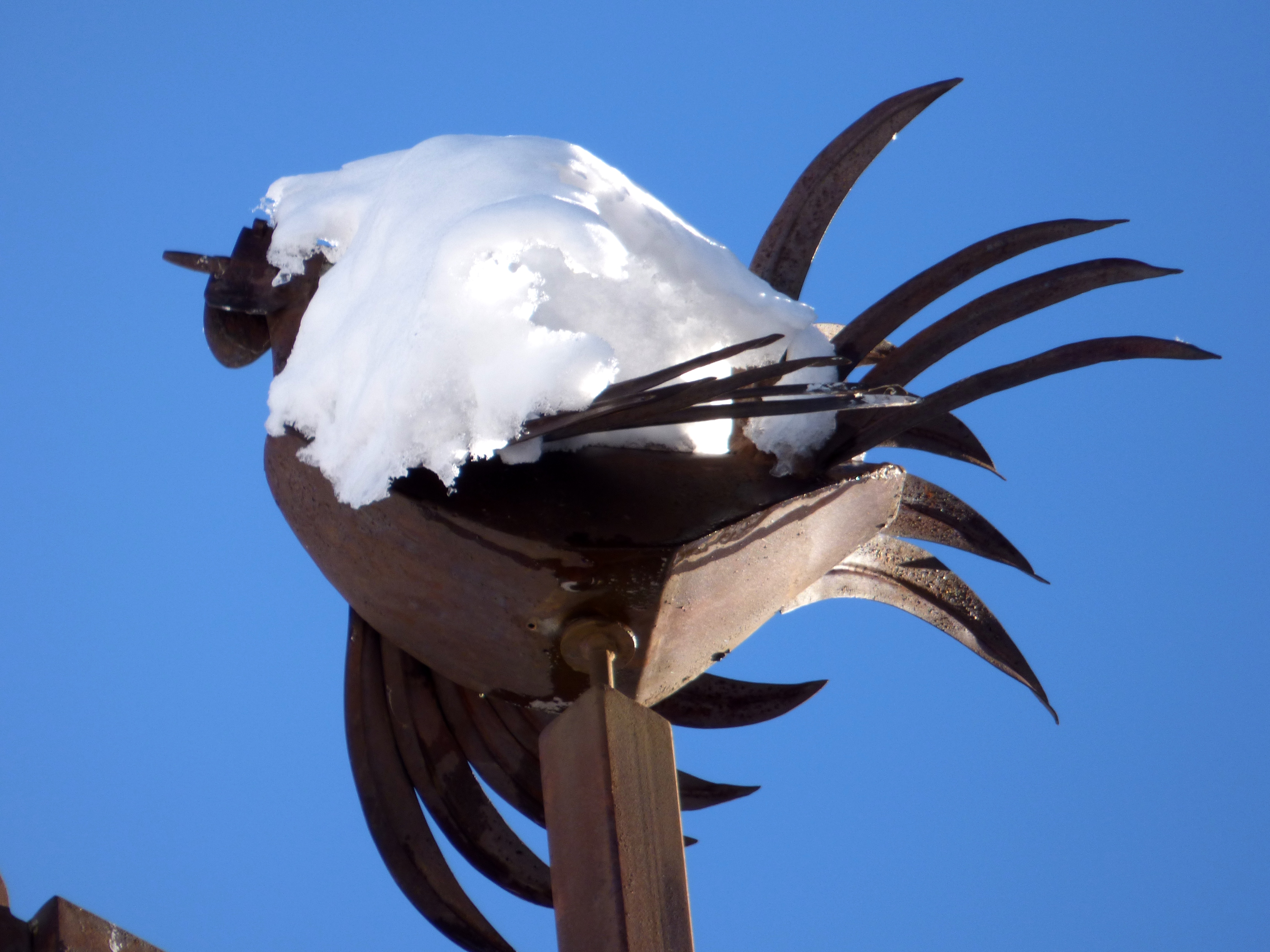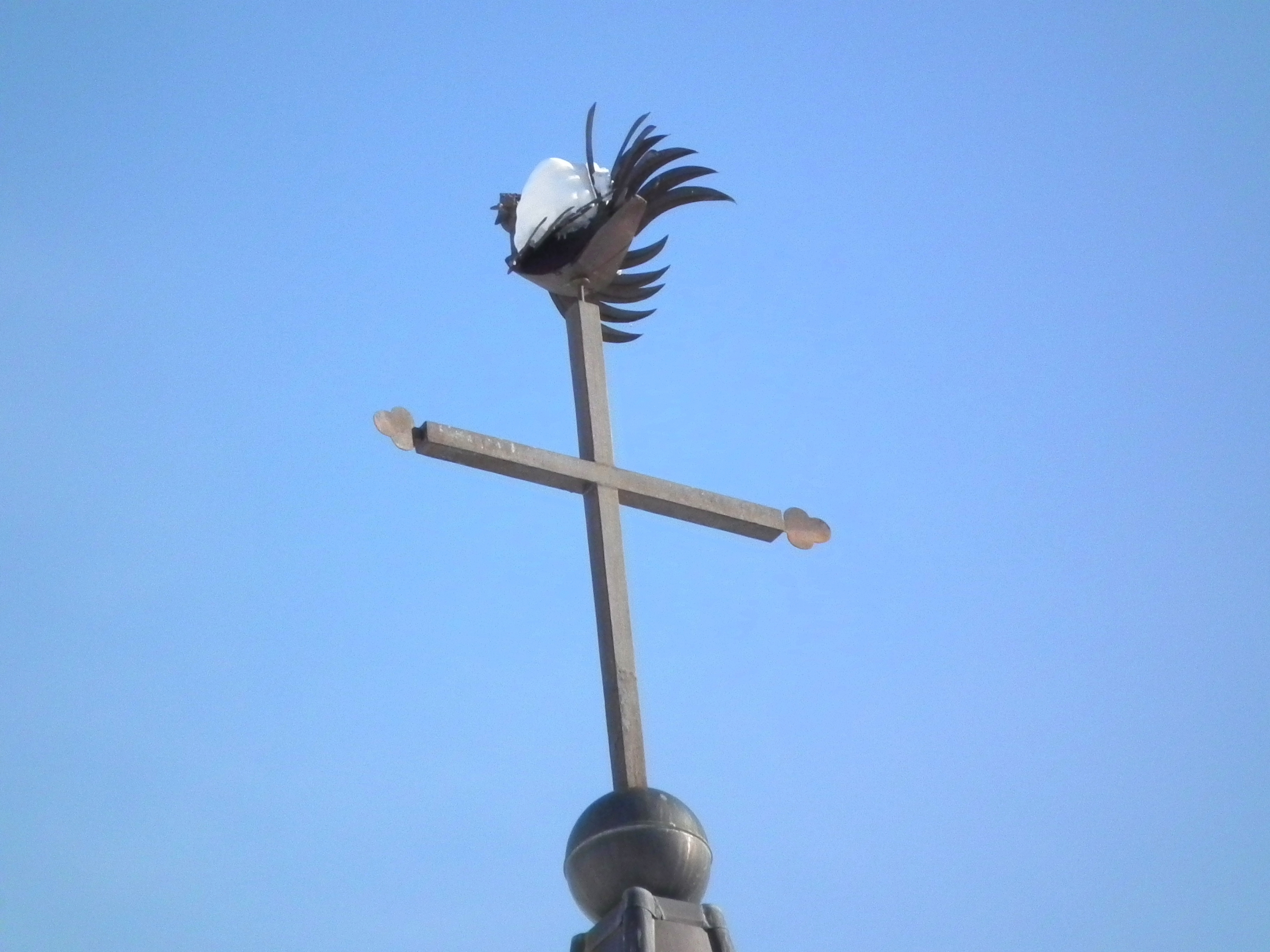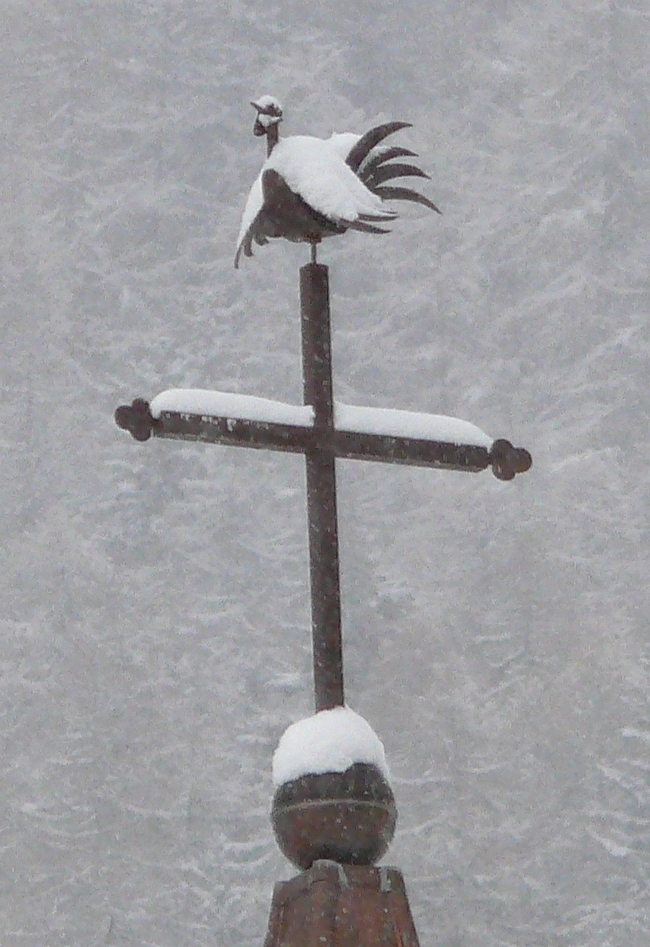 Toit couvert de tôle grise se terminant en pointe. L’ensemble boule-croix trefflée-coq est moderne. (refait “à l’identique” en 2000) Le coq, toutes plumes au vent, retient bien la neige !