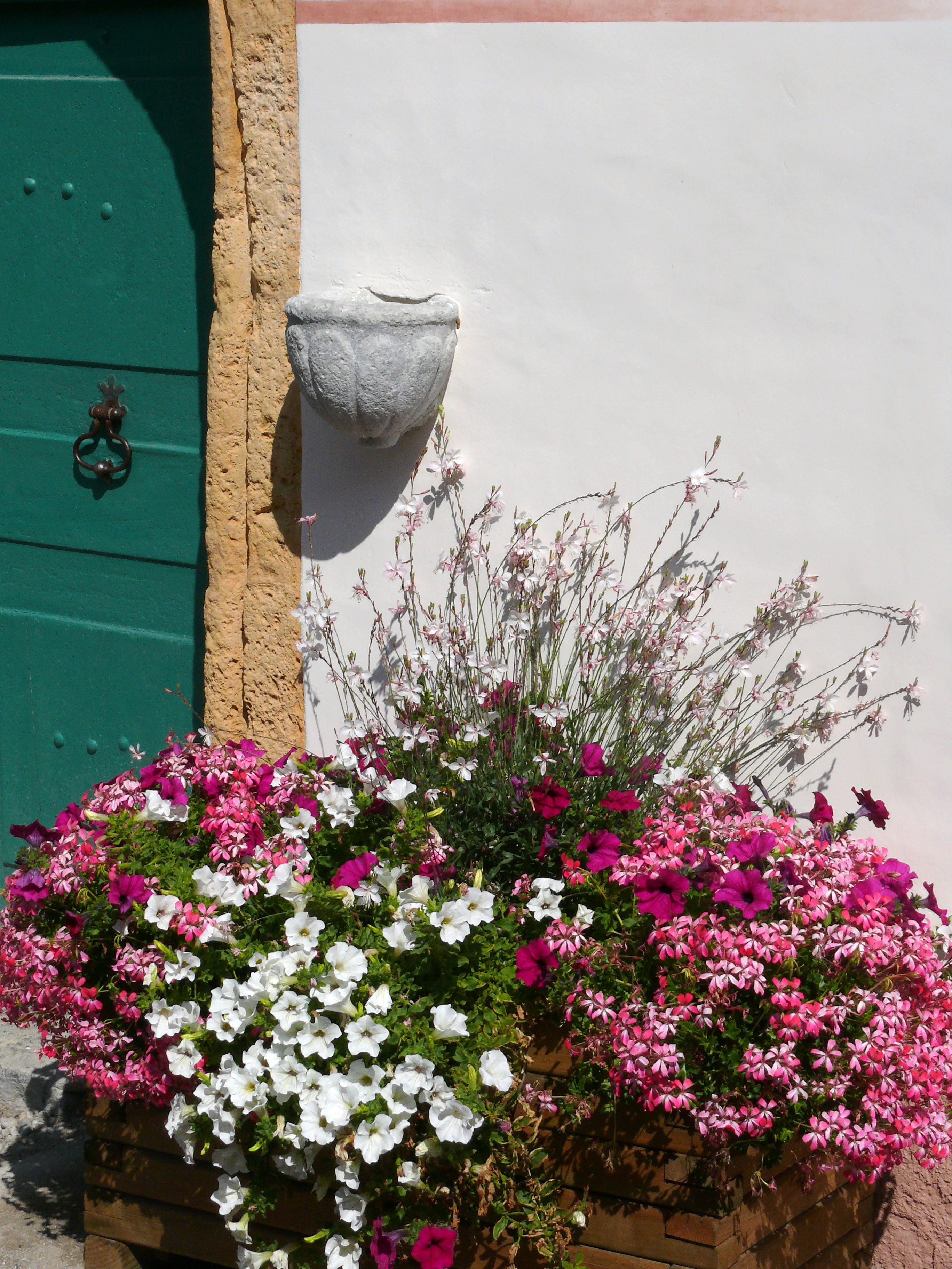 - les bords de la façade en trompe l’oeil gris, imite les pierres de taille.