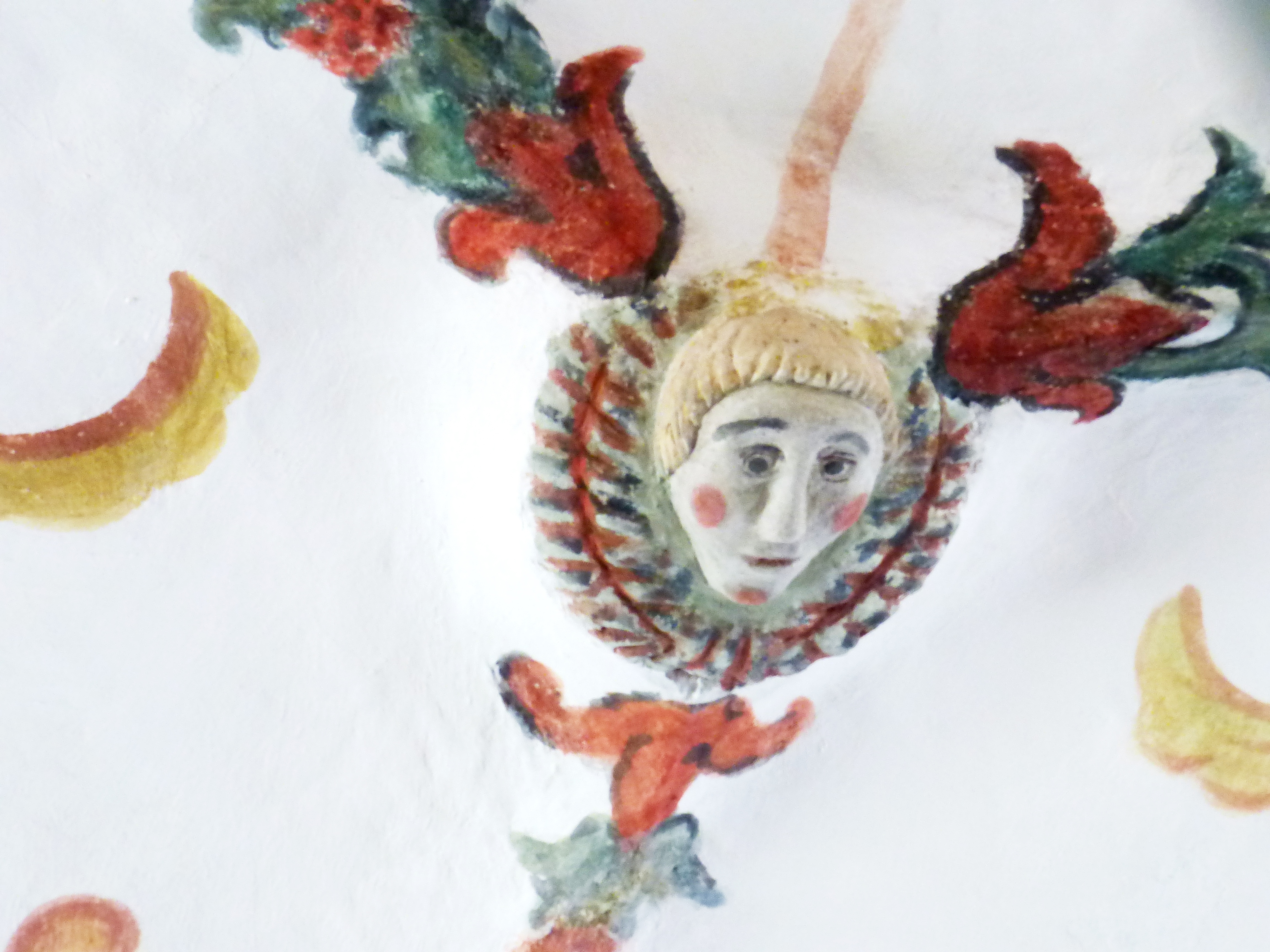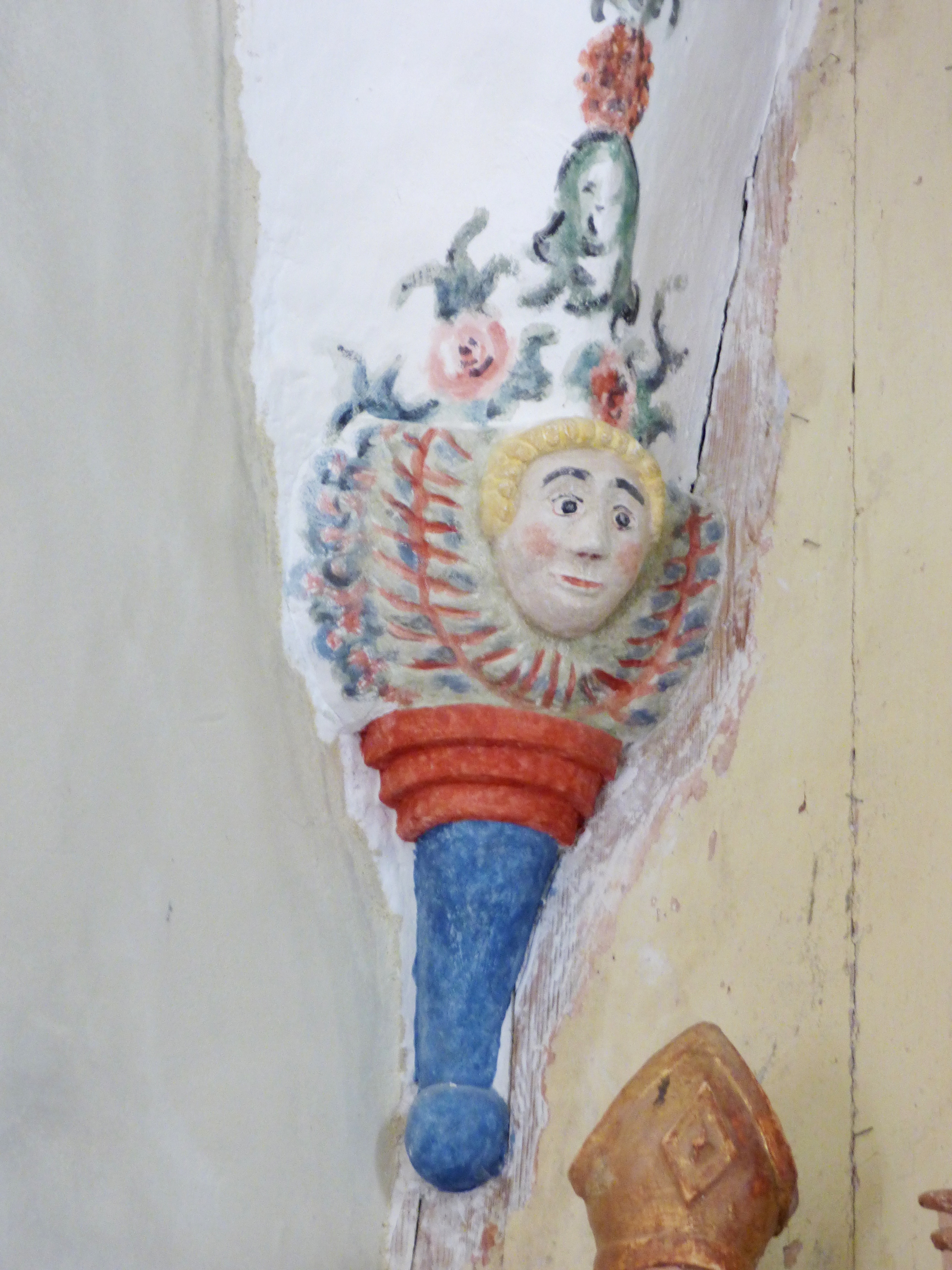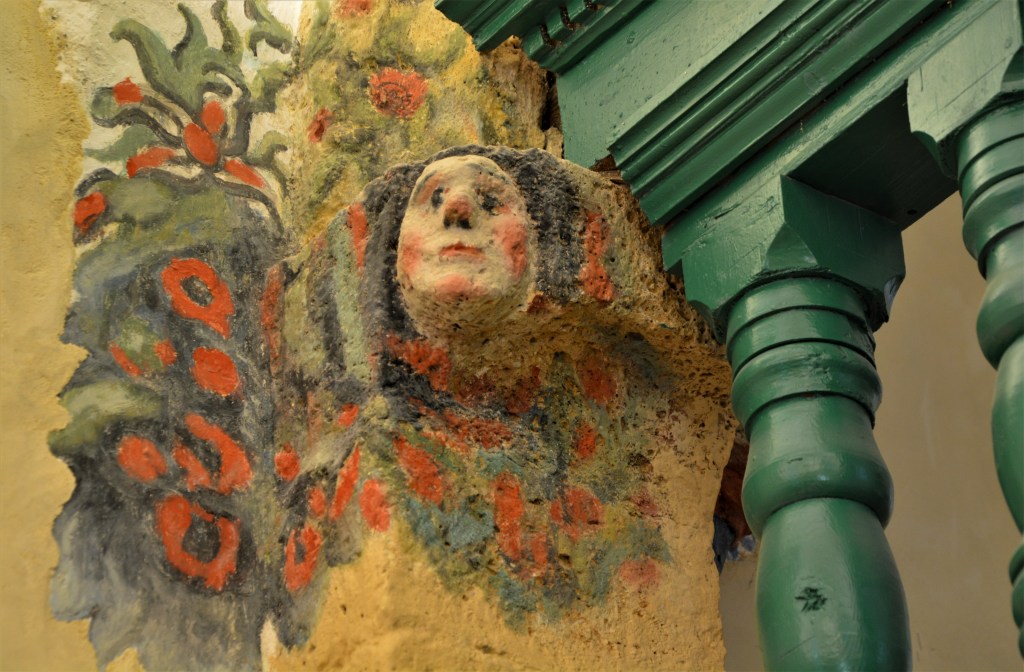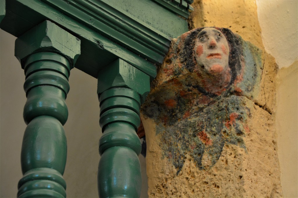 Cependant le plus rare ce sont les têtes (d’anges ?) entourées de feuillages et fleurs, sculptées à même le tuf d’un chapiteau de colonne.