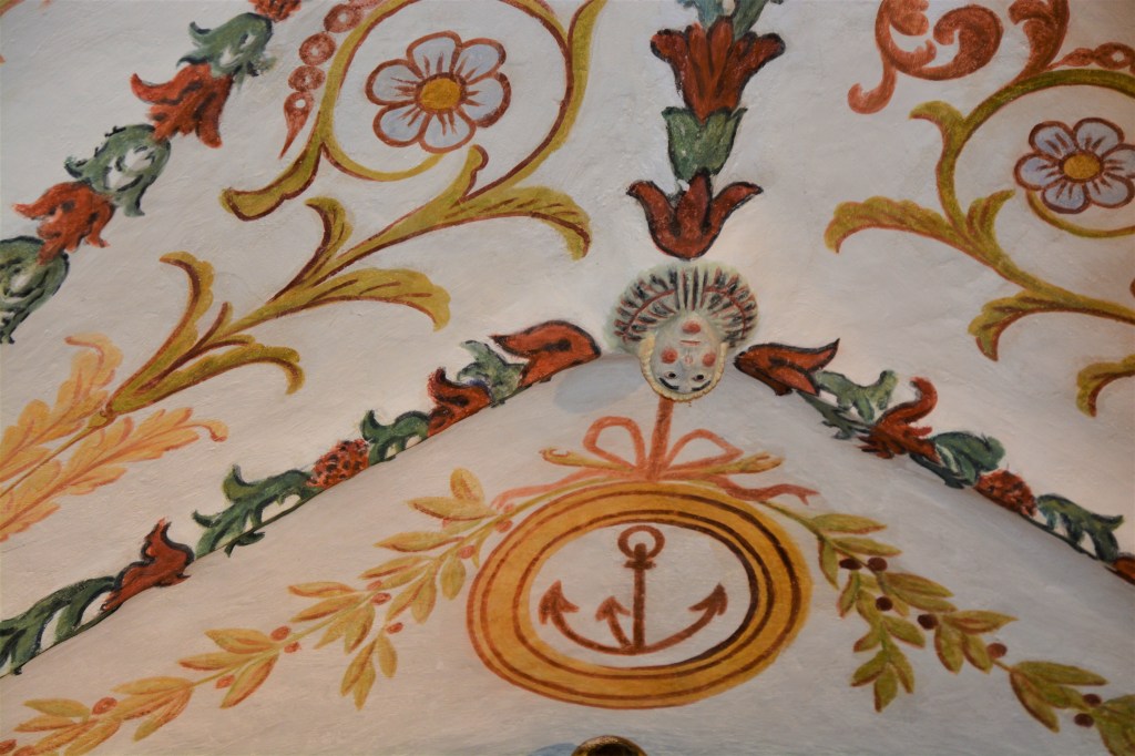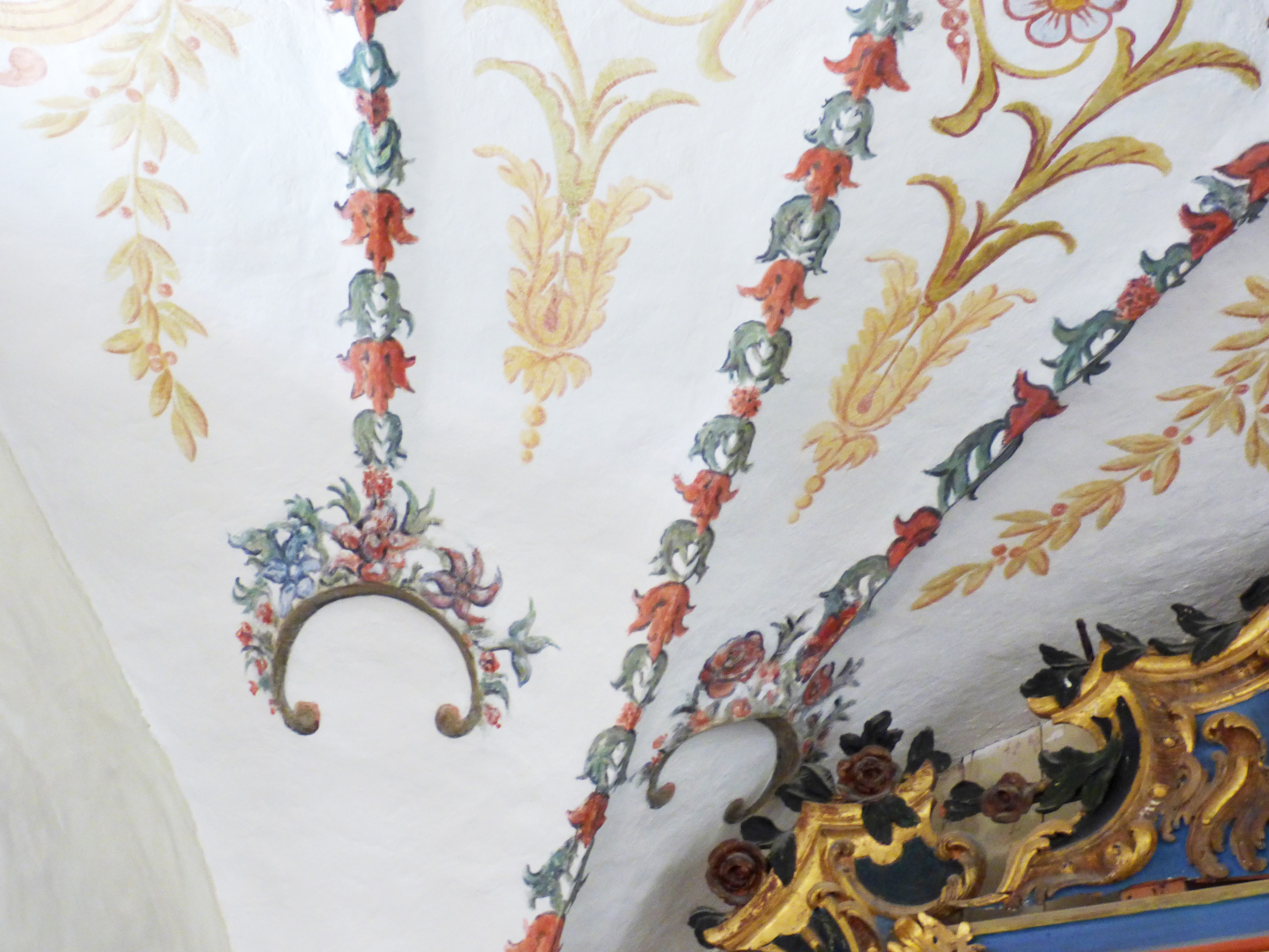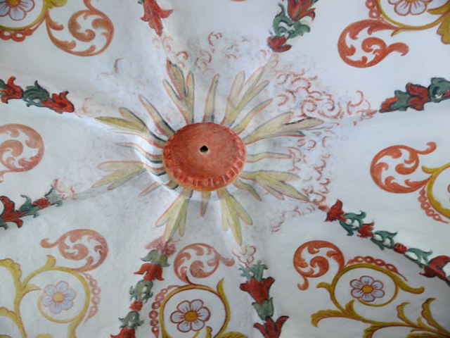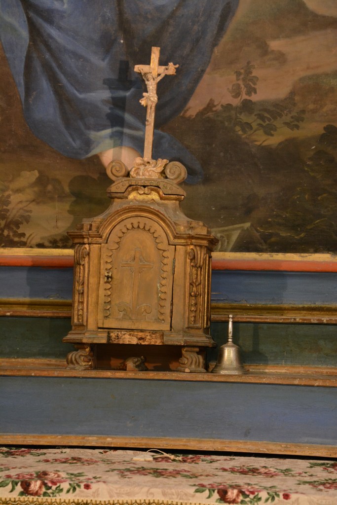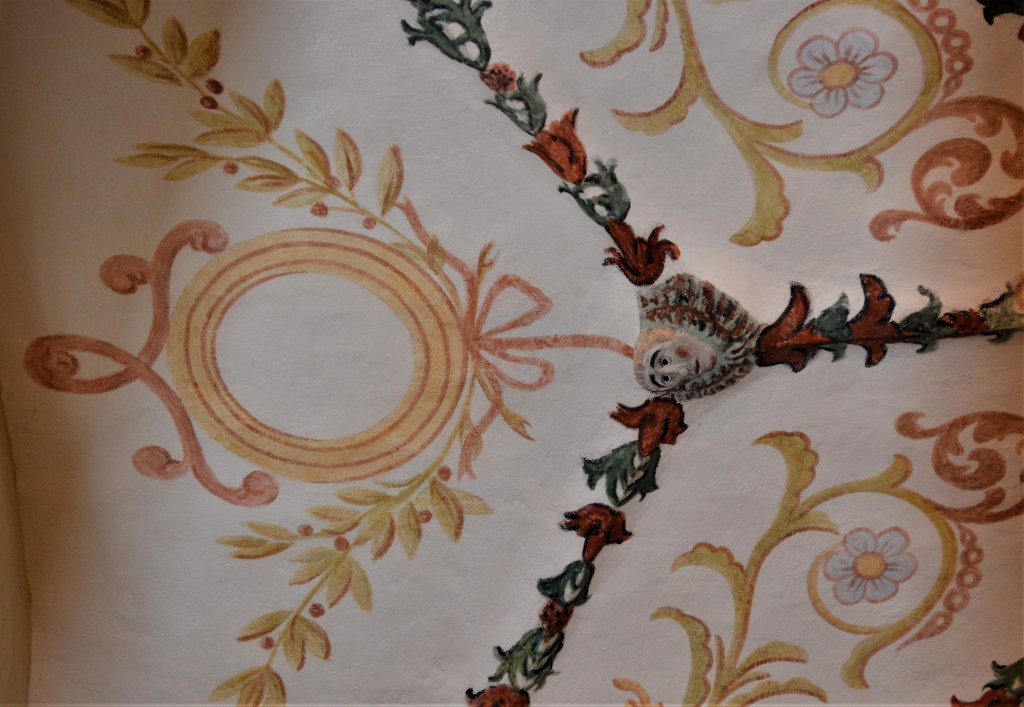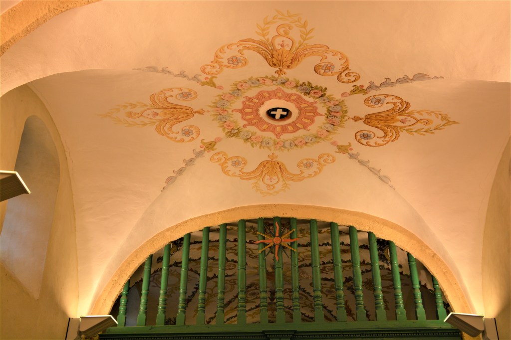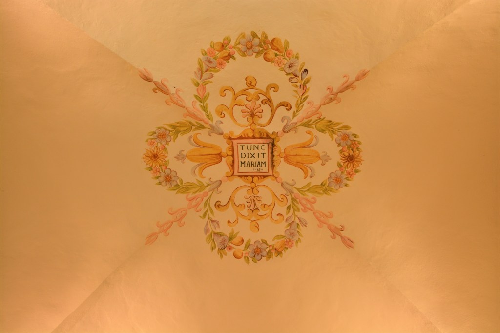 La nef est séparée du chœur par un arc en berceau sur colonnettes. Là aussi ce sont les fresques du plafond qui attirent l’œil : une pour chaque voûte d’arête. Des fleurs et volutes autour d’une petite croix carrées et l’autre autour d’n petit texte en latin. (Tunc dixit mariam)