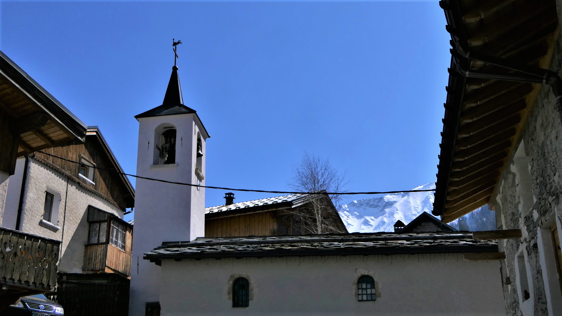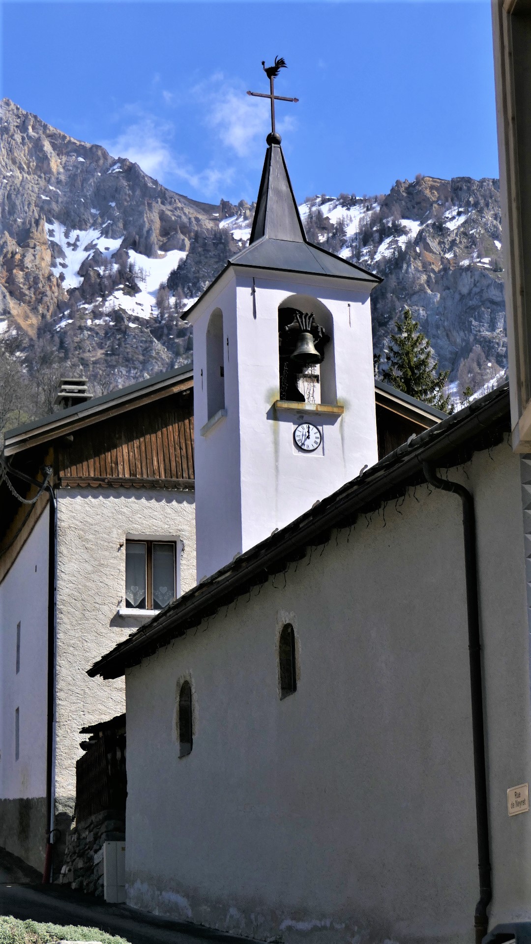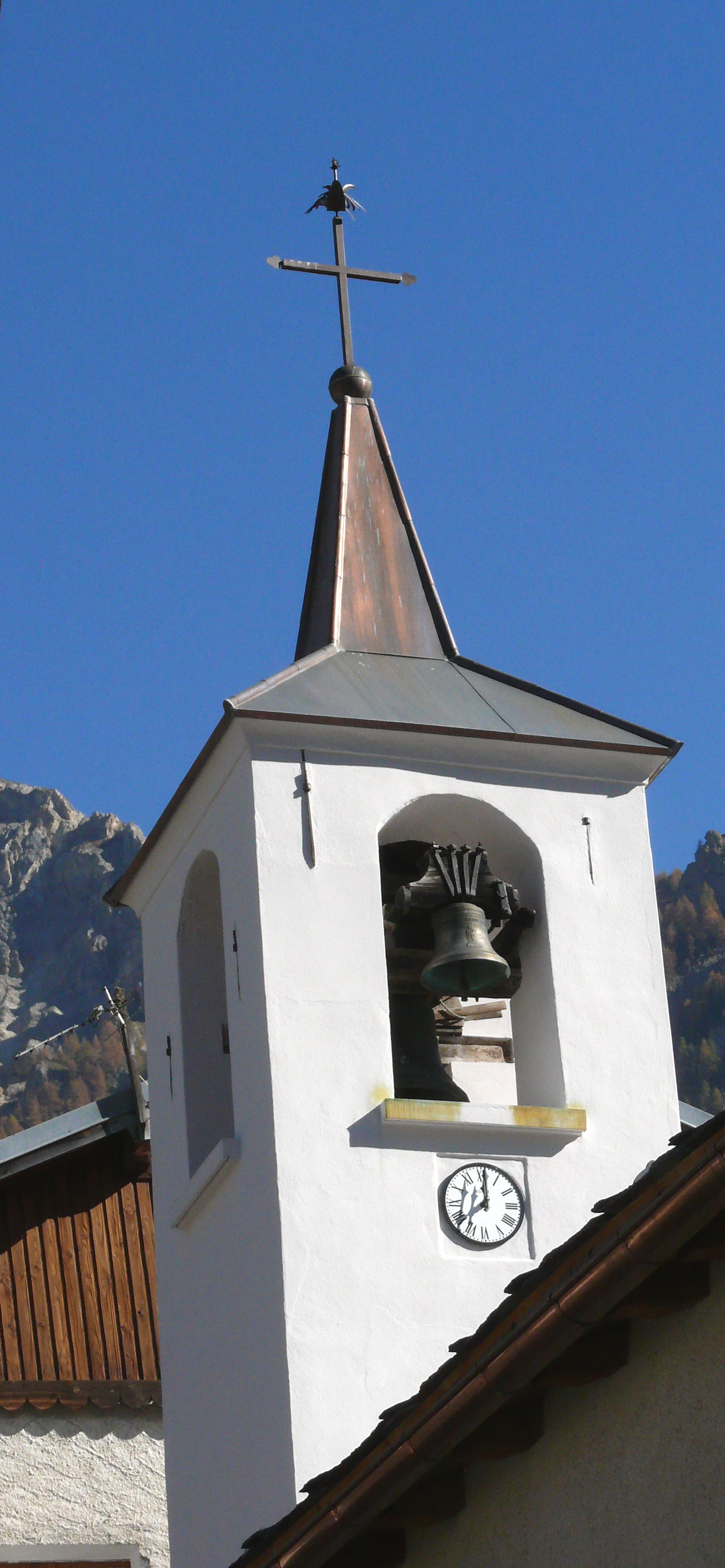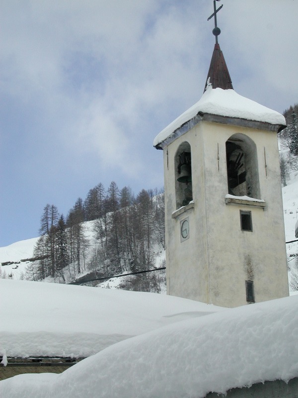 Le clocher contient 2 cloches : l’une fondue en 1819 à Conflans, a été offerte par le père Claude Maurice Gontharet, aumônier de l’hôpital Lariboissière à Paris ( il a également offert la statue de St François de Sales à Peisey)