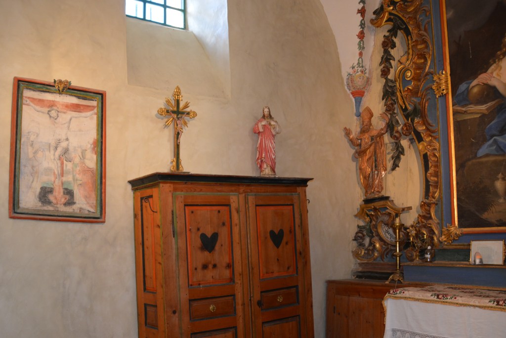 Le chœur mesure 15 m2. Il est meublé d’une jolie armoire en arolle, sur laquelle est installé le crucifix et une statuette sacré cœur, du d’une statue de la vierge (qui a perdu sa main) présentant l’enfant Jésus. Enfin sur l’autel est installé un curieux petit tabernacle de point non peint. Hors-mis le retable, les éléments remarquables sont les fresques du plafond en voûte croisée à liernes et tiercerons : guirlandes de fleurs autour d’un beau chardon-soleil, deux médaillons (tables de la loi et ancre). Les clefs de voûtes sont décorées de têtes d’anges naïves ainsi que les culs de lampes.